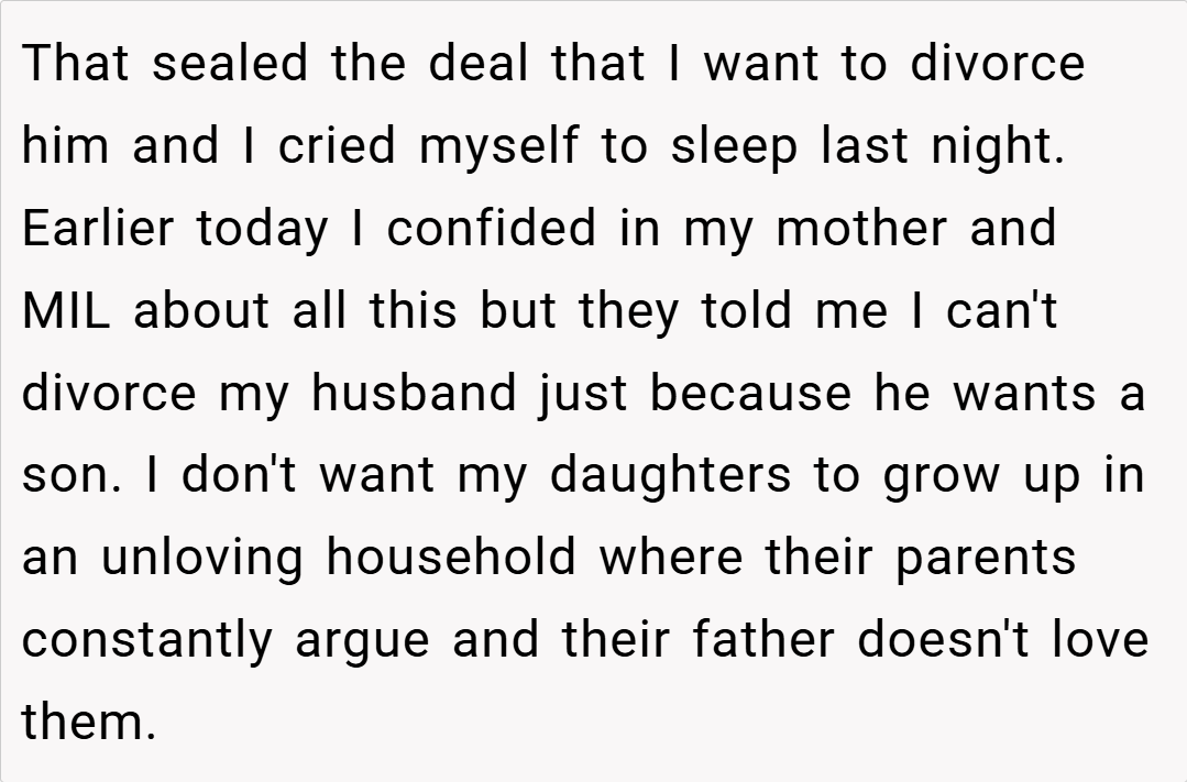 AITA For Wanting To Divorce My Husband Because He Wants A Son?