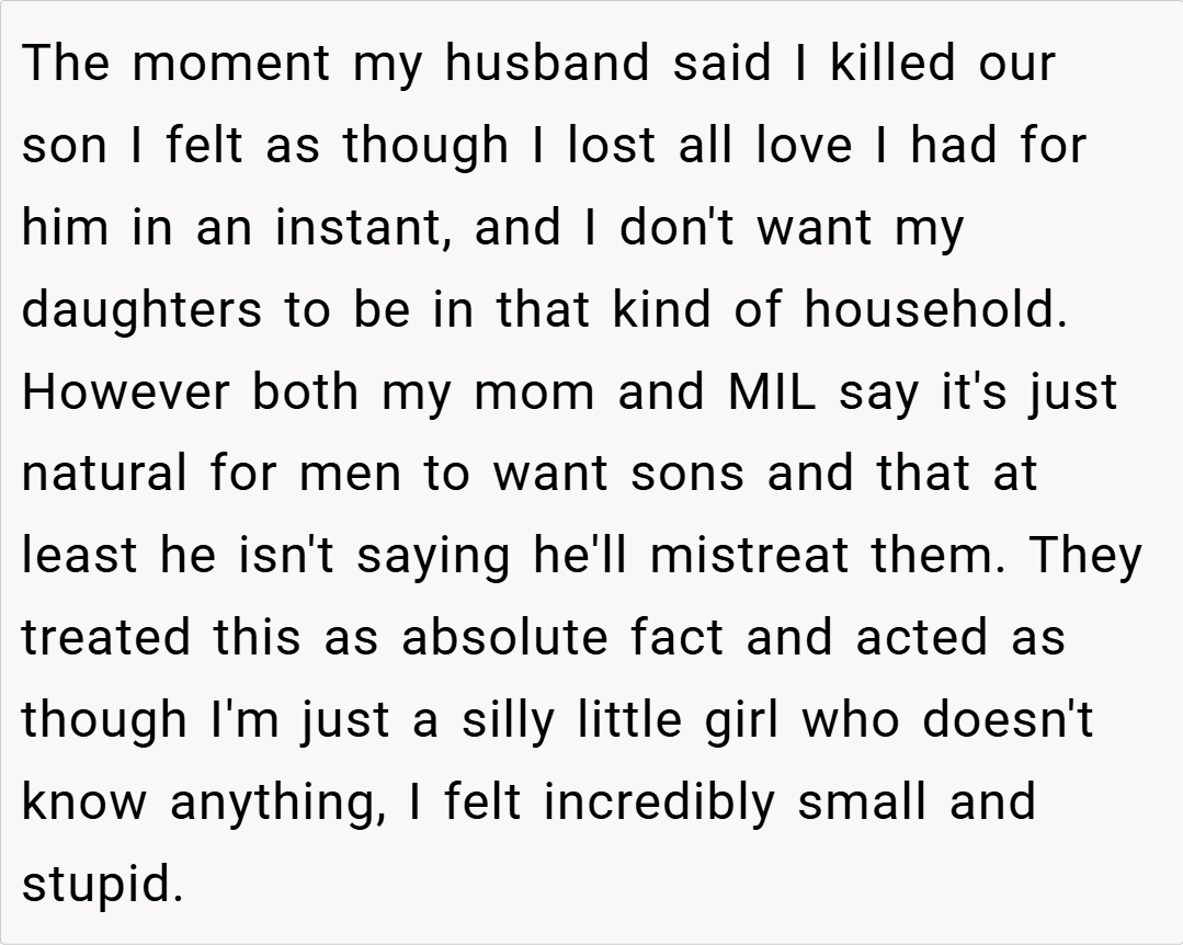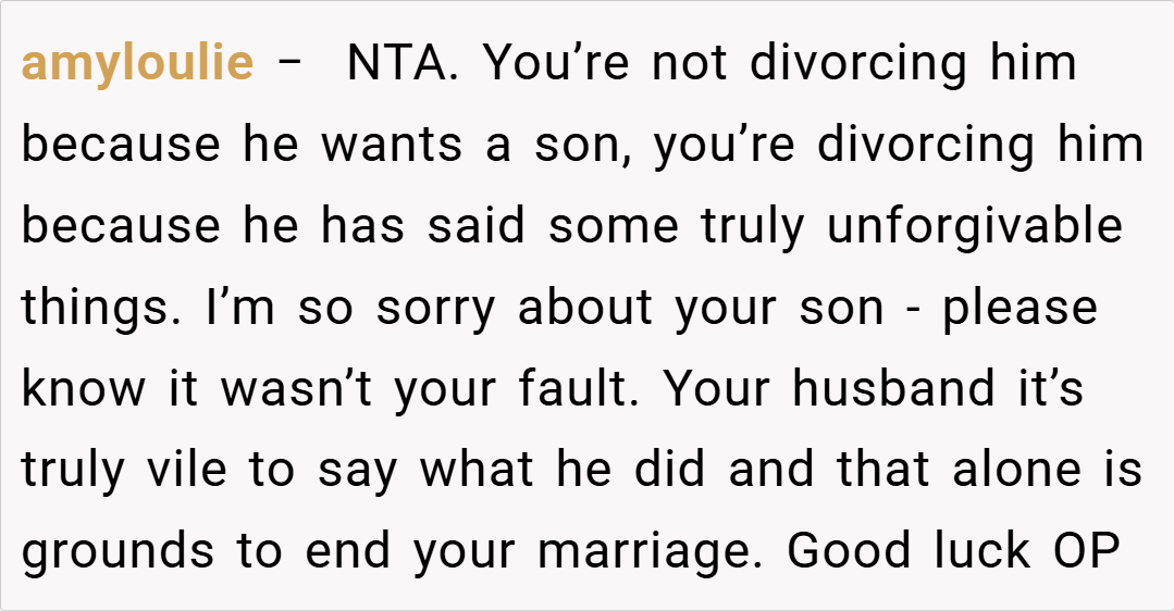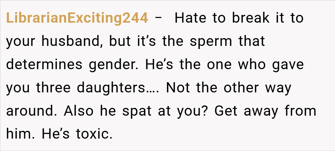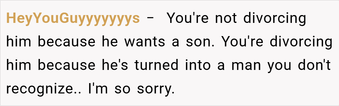 Many redditors expressed shock and sympathy, with several questioning how anyone could build a marriage on such conditional terms. Some joked that the husband needed to enroll in a modern parenting class, while others emphasized that a partner’s love should never hinge on gender.