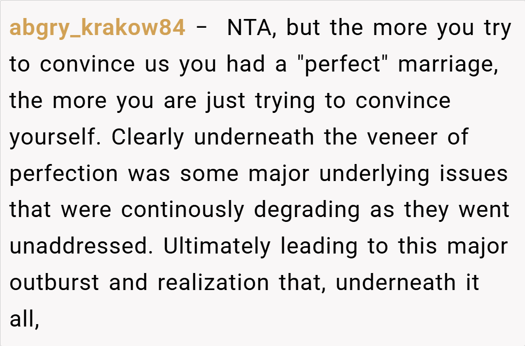 Instead of nurturing that fragile recovery, the husband’s outburst revives old wounds, transforming grief into a battleground for his unmet expectations. This painful conflation of past sorrow with present demands creates an environment where unconditional love is replaced by conditional acceptance, leaving the wife to question not only her partner’s love but also her own self-worth.