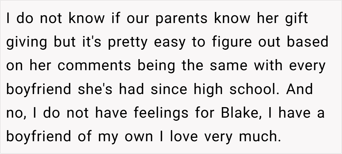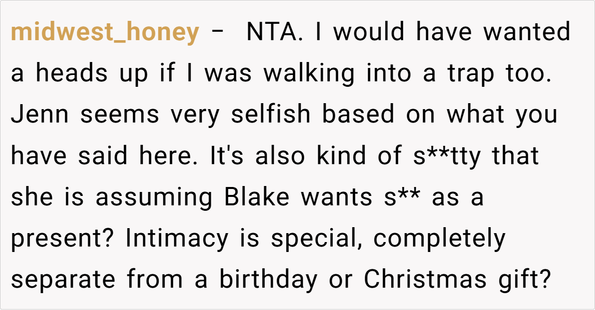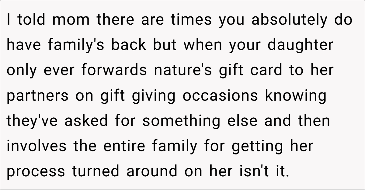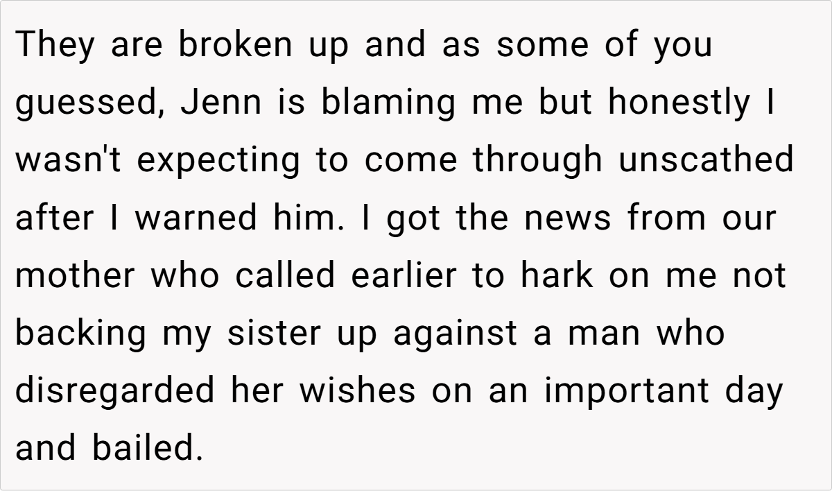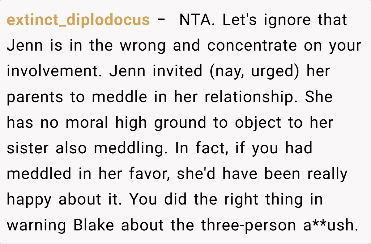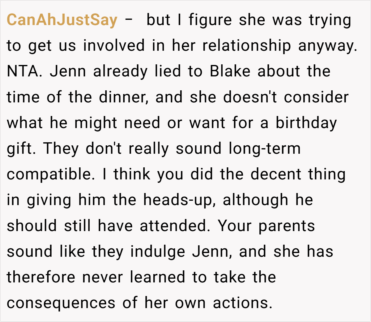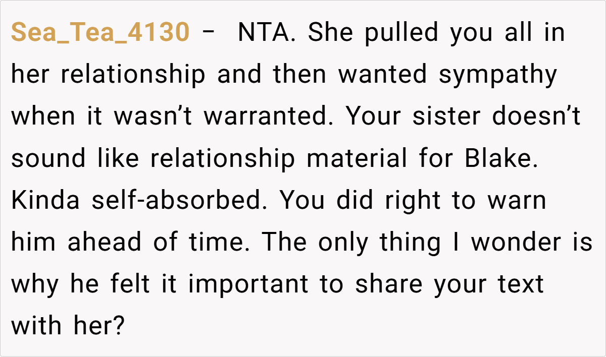 In essence, the community felt that the sister’s decision to text Blake was justified given the context, as it exposed the red flags in Jenn’s approach. The consensus: family should help when needed, but not at the expense of turning every minor disagreement into a full-blown intervention.