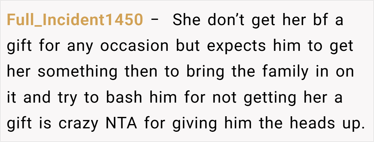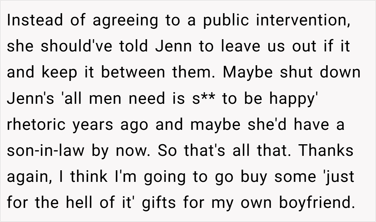 The Reddit community’s overall sentiment is clear: many believe that Jenn’s actions were a recipe for disaster. Commenters expressed that her method of “setting up” her boyfriend for a lecture was both manipulative and counterproductive. They argue that while it’s natural to want family support in personal matters, dragging them into relationship disputes only muddles the issue.