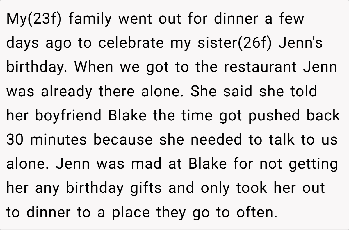 Jenn, already waiting alone at the restaurant, revealed that she had deliberately delayed her boyfriend Blake’s arrival to have a private family talk about his lack of thoughtful gift-giving. What began as a small celebration quickly morphed into a full-blown family dispute—one where expectations, hurt feelings, and long-standing relationship patterns collided in one awkward evening.