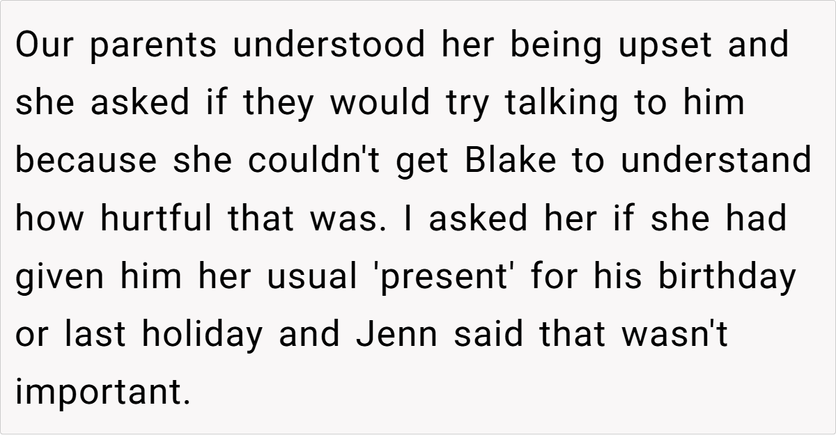 Navigating relationship expectations within a family can be a minefield. When personal grievances spill into family gatherings, it can create a domino effect that affects everyone involved. In this case, Jenn’s insistence on orchestrating a “family intervention” regarding Blake’s gift-giving habits reflects a broader pattern of using family loyalty as a bargaining chip in her relationship.