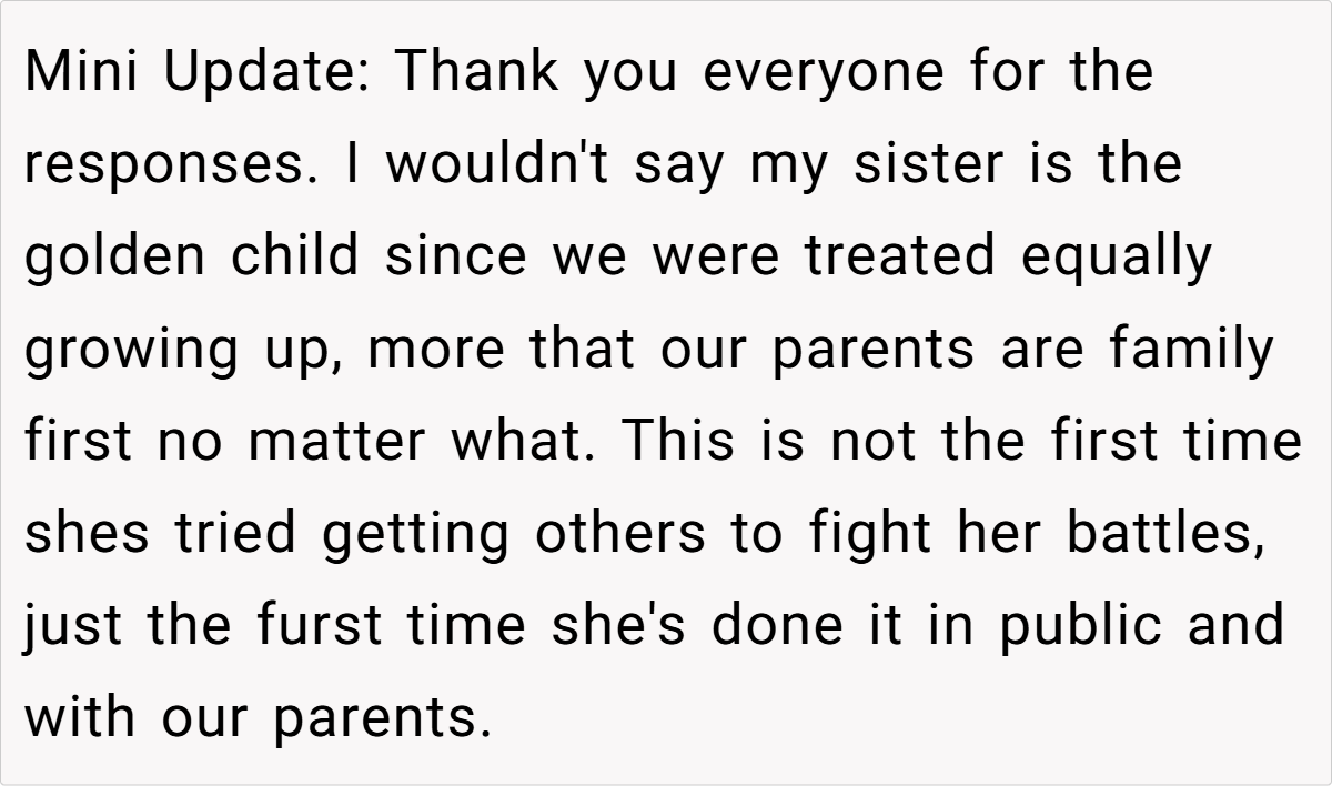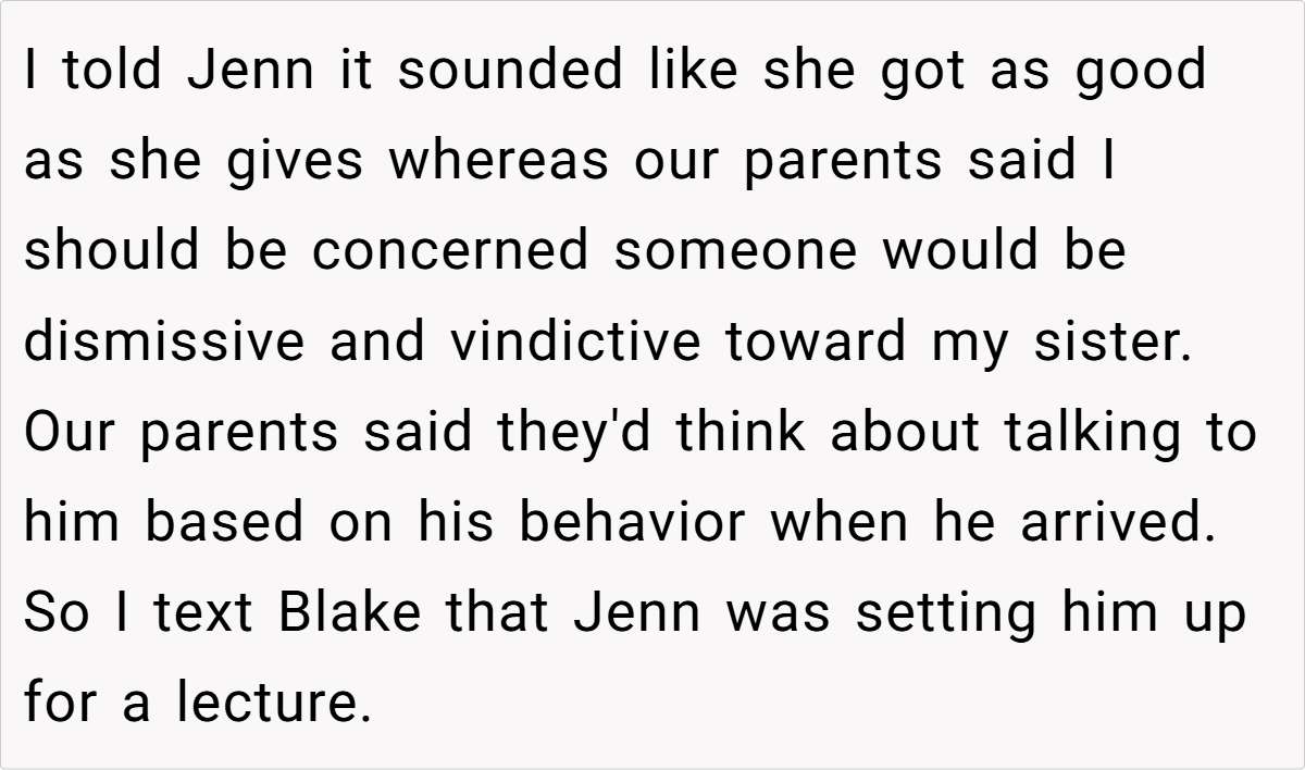 As the evening unfolded, it became clear that Jenn’s method of expressing her discontent was to involve the entire family in her personal relationship issues. Her behavior, which seemed designed to force her loved ones into taking sides, ultimately left her younger sister (23F) caught in the crossfire.