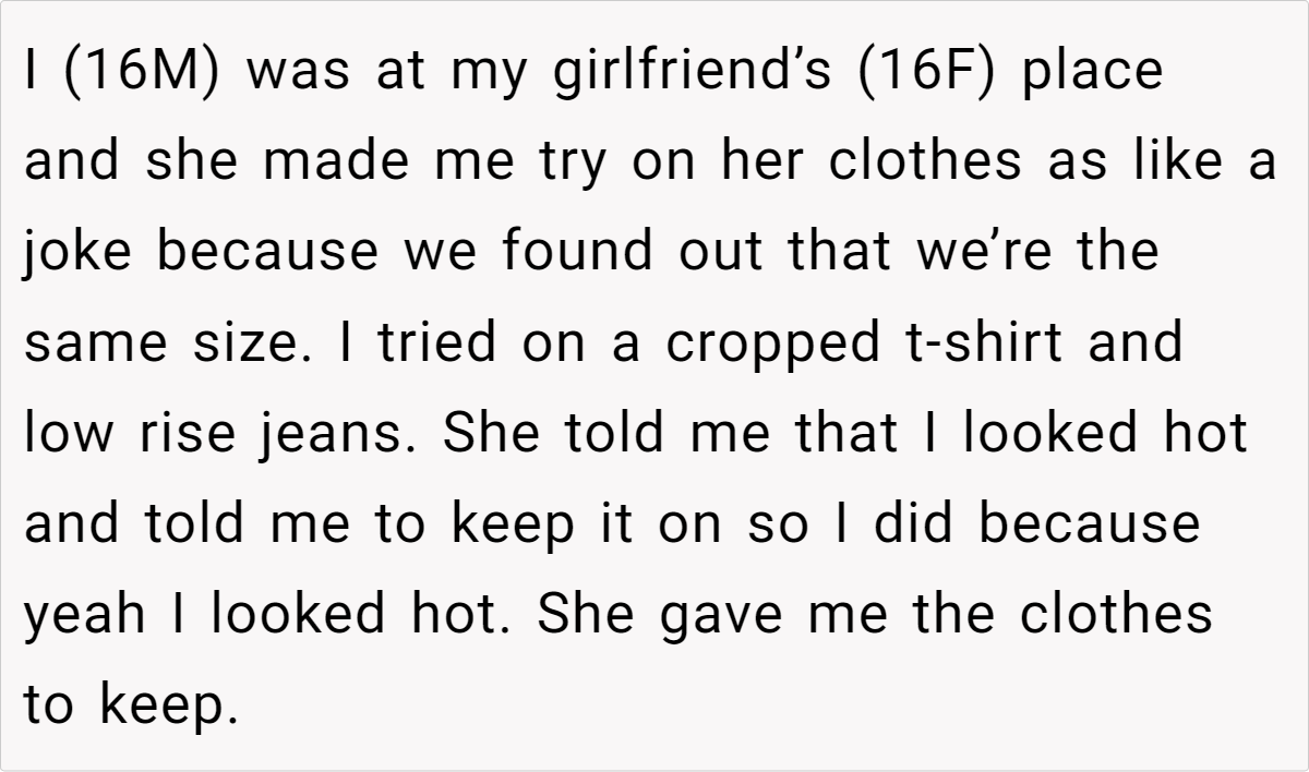 Expressing your individuality through clothing choices is a natural part of finding out who you are—especially during your teenage years. In this story, a 16-year-old tried on his girlfriend’s clothes for fun and found that he loved how he looked, even taking the outfit home. Yet his parents immediately reacted with anger and humiliation, demanding he change and even questioning his sexual orientation.