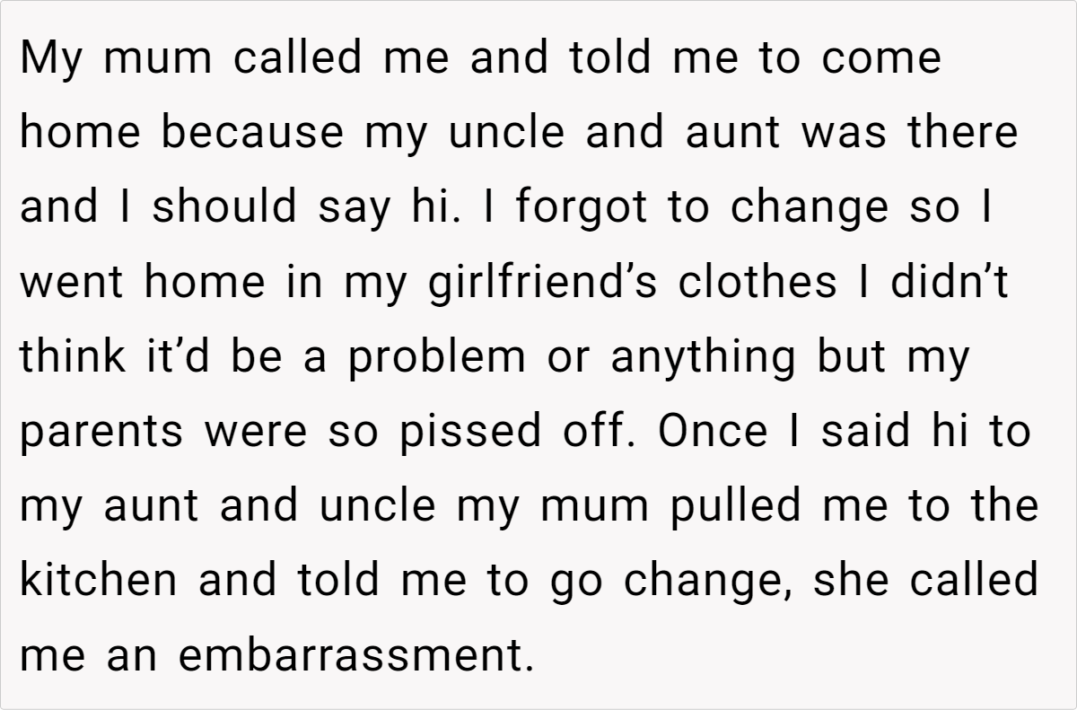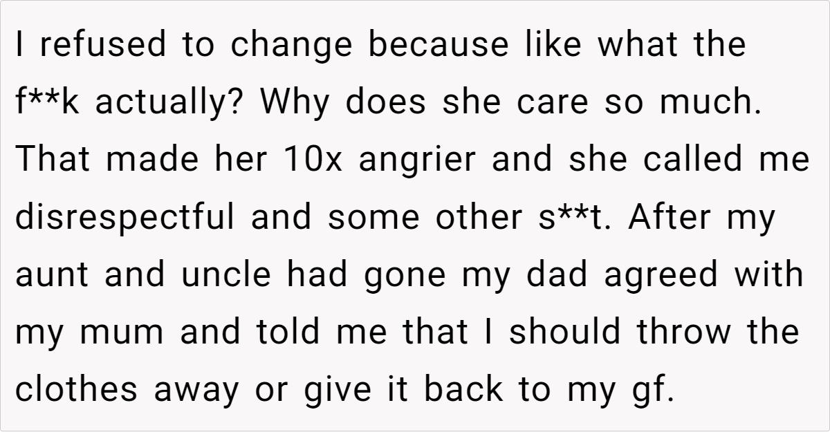 Why such a big fuss over one outfit? Although parents often worry about how their children present themselves, it becomes problematic when they resort to insults, assumptions, or narrow-minded stereotypes. What started as a playful experiment between two teenagers quickly escalated into a family conflict—shedding light on generational differences around gender norms and the importance of respecting an individual’s choice in self-expression.