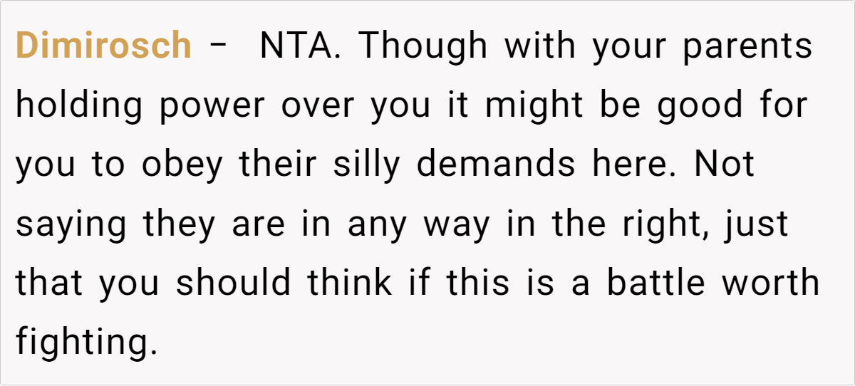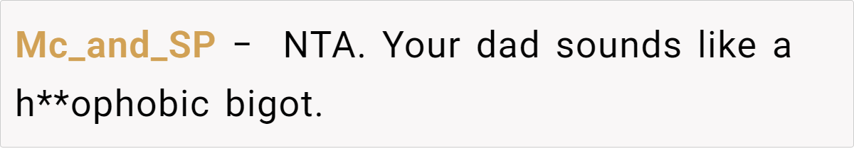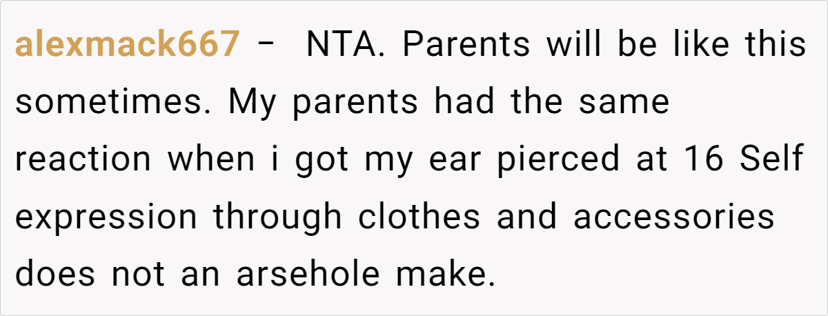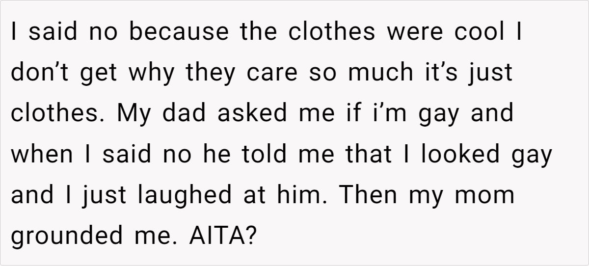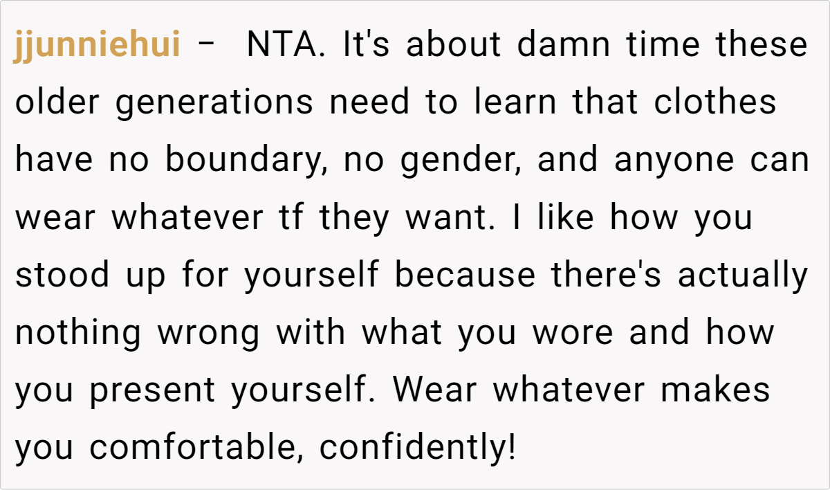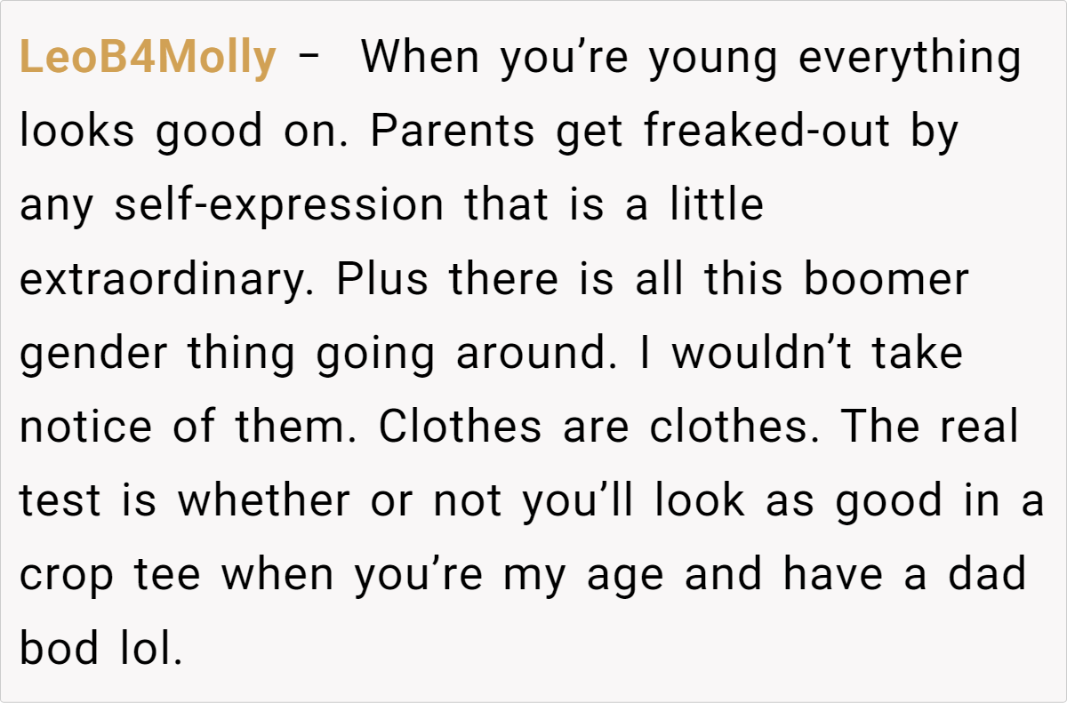 Redditors largely affirm the teen’s right to wear whatever makes him feel good, pointing out that clothes don’t inherently reflect or dictate one’s sexual orientation. Many note that generational gaps often cause friction over style and self-expression. They also highlight that the father’s immediate leap to homophobic remarks is problematic and indicative of bigger prejudices than just clothing choices.