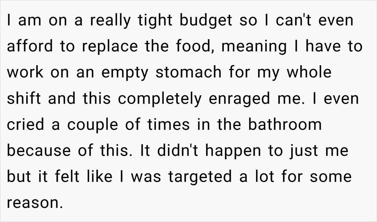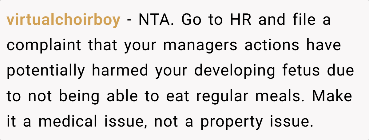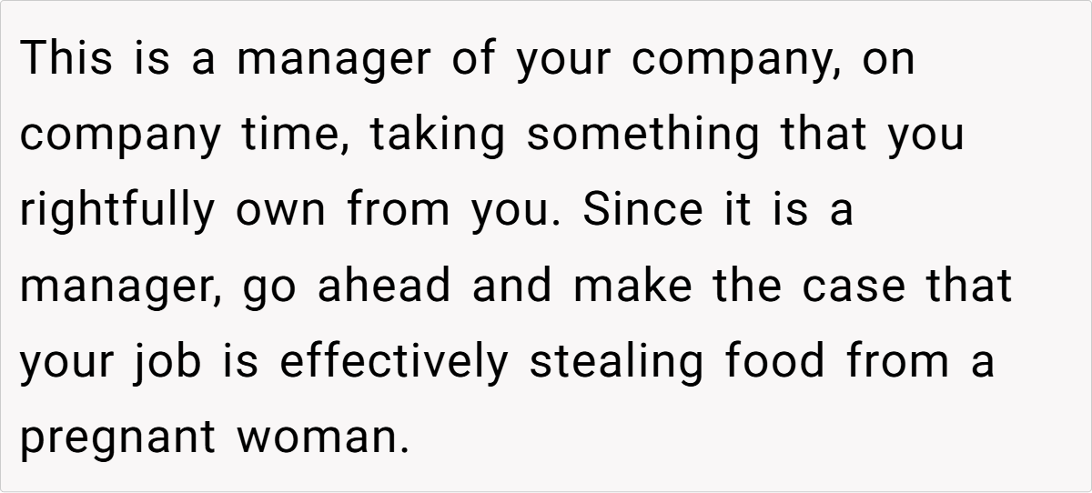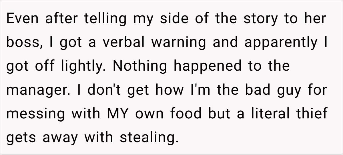 Most Redditors firmly sided with OP, arguing that she had every right to defend her food. Many pointed out that the manager should be the one receiving consequences, not OP.