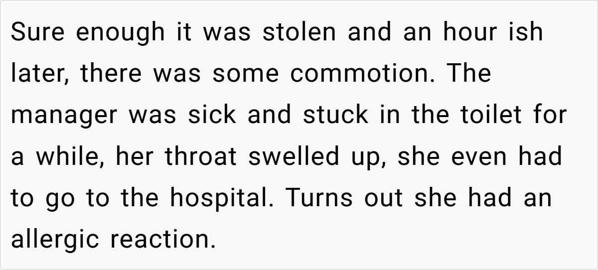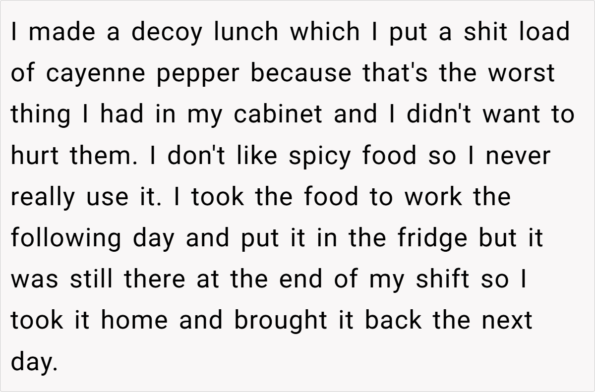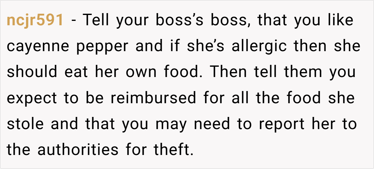 OP works at a family-owned company and has been dealing with someone repeatedly stealing her lunch. OP decided to create a decoy meal packed with cayenne pepper. When her meal was inevitably stolen, it led to unexpected consequences—her manager had a severe allergic reaction and ended up in the hospital. Scroll down to read the entire story!