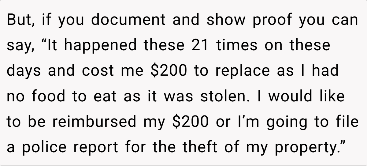 2. Keeping a record of stolen meals can help build a case if further action is needed.