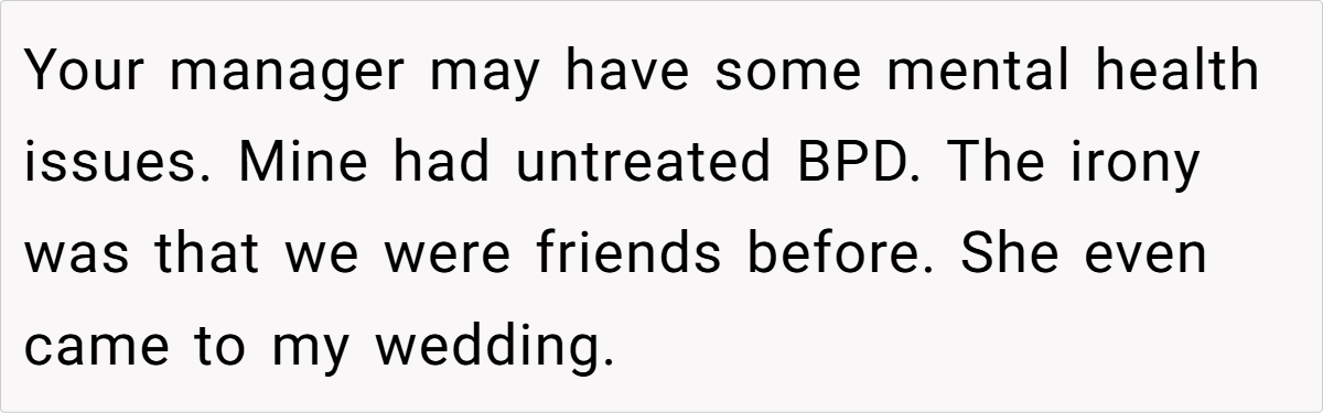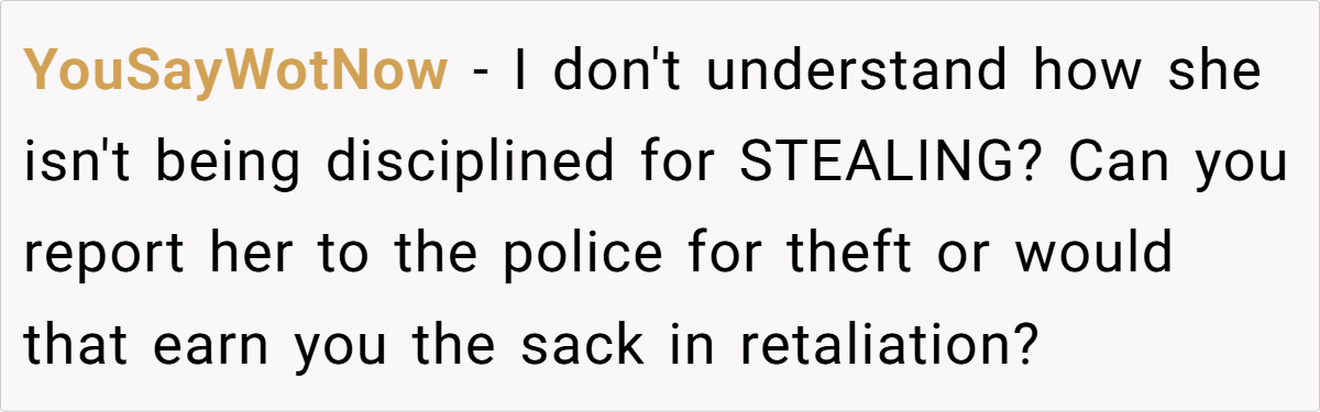 OP’s situation is particularly difficult because her manager, the very person responsible for maintaining fairness, is the offender. This makes it nearly impossible for OP to seek justice through conventional HR channels.