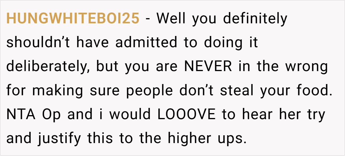 According to employment lawyer David Shaw, “While food tampering is legally murky, OP technically did nothing wrong. She prepared a meal for herself, not with the intention to harm but to deter theft. However, since the result led to medical harm, companies may use this against an employee regardless of fault.”