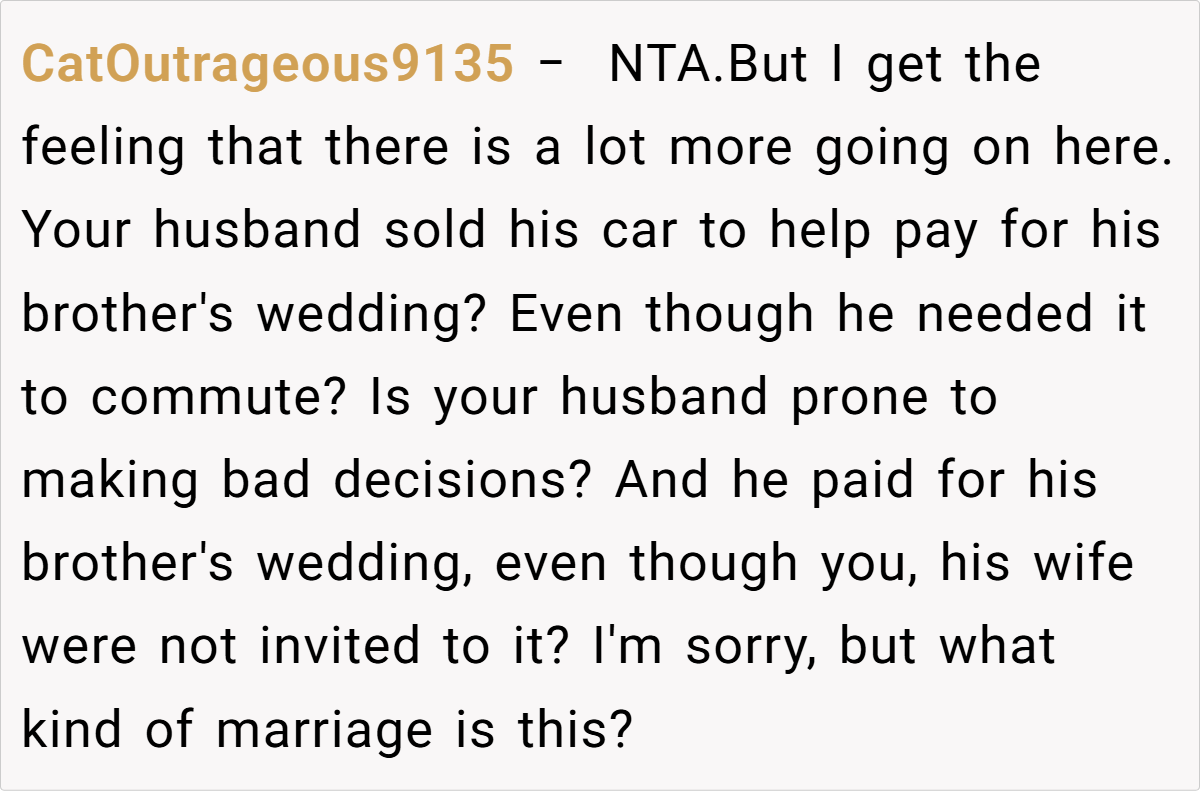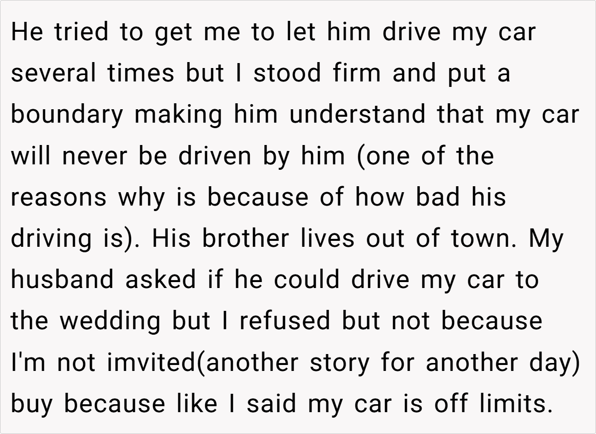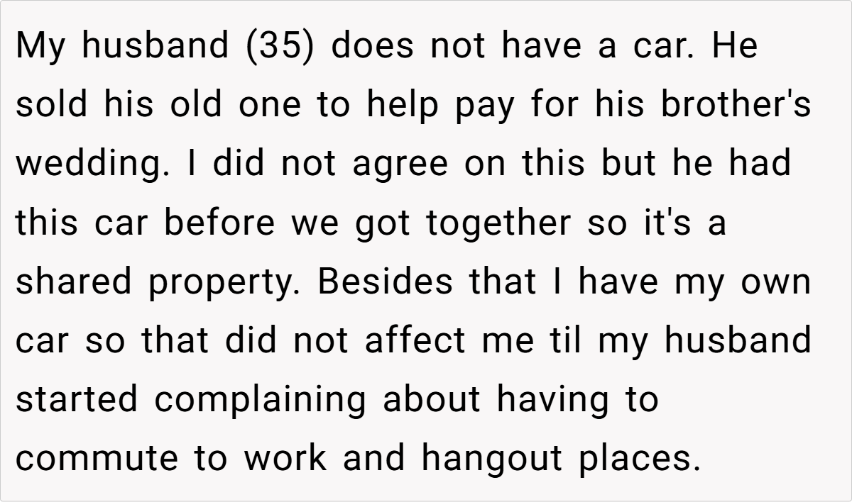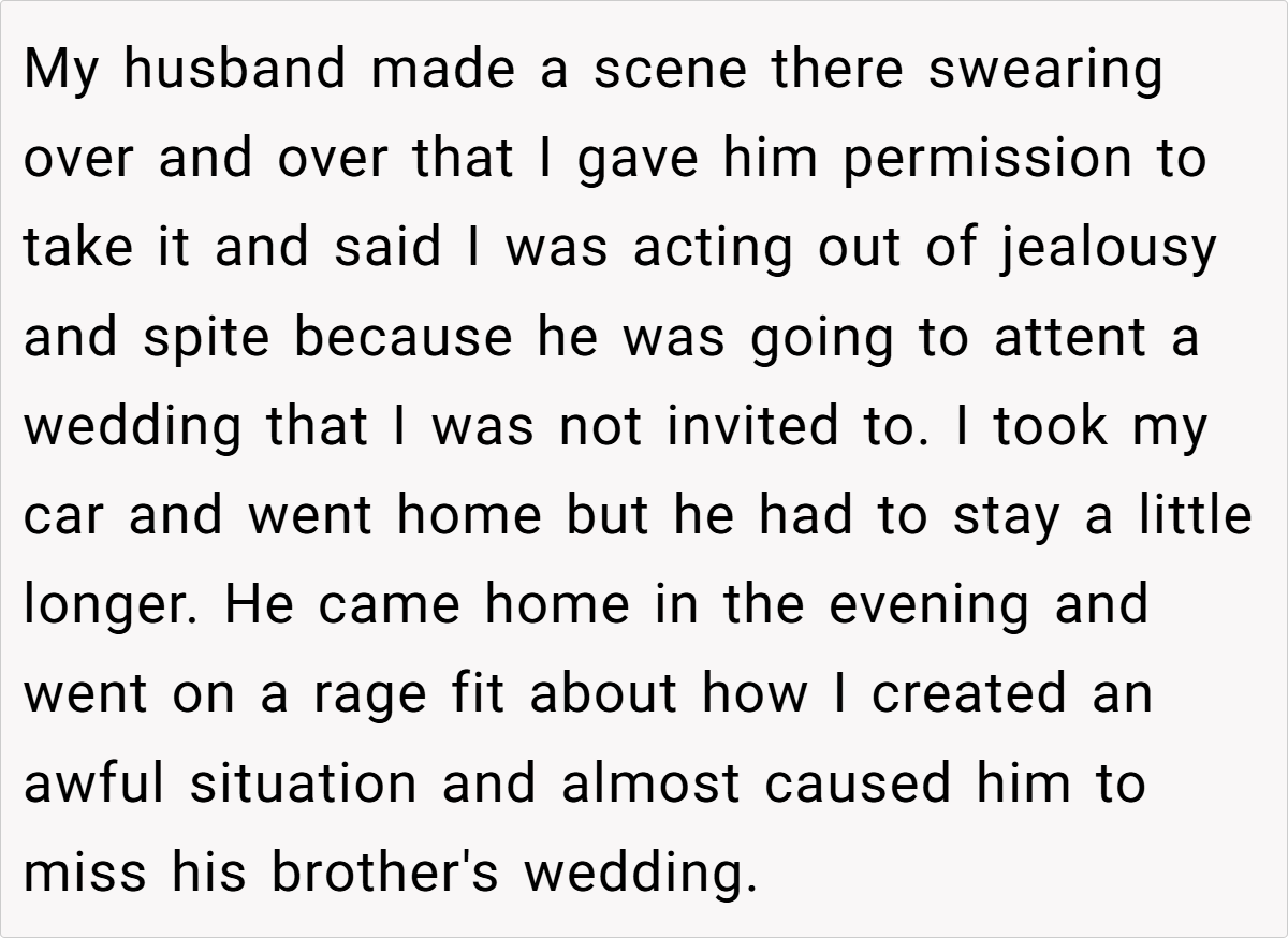 When a shared asset becomes the battleground for marital boundaries, things can quickly spiral into chaos. In this case, a wife’s firm stance about keeping her car off limits turned into a full-blown domestic drama. Despite owning her own vehicle, she refused to let her husband—whose poor driving record was notorious—use her car for his long, grueling commute. When her husband took the car without permission to attend his brother’s out‐of‐town wedding, the situation escalated dramatically, leaving both parties reeling from a cascade of miscommunications and hurt feelings.