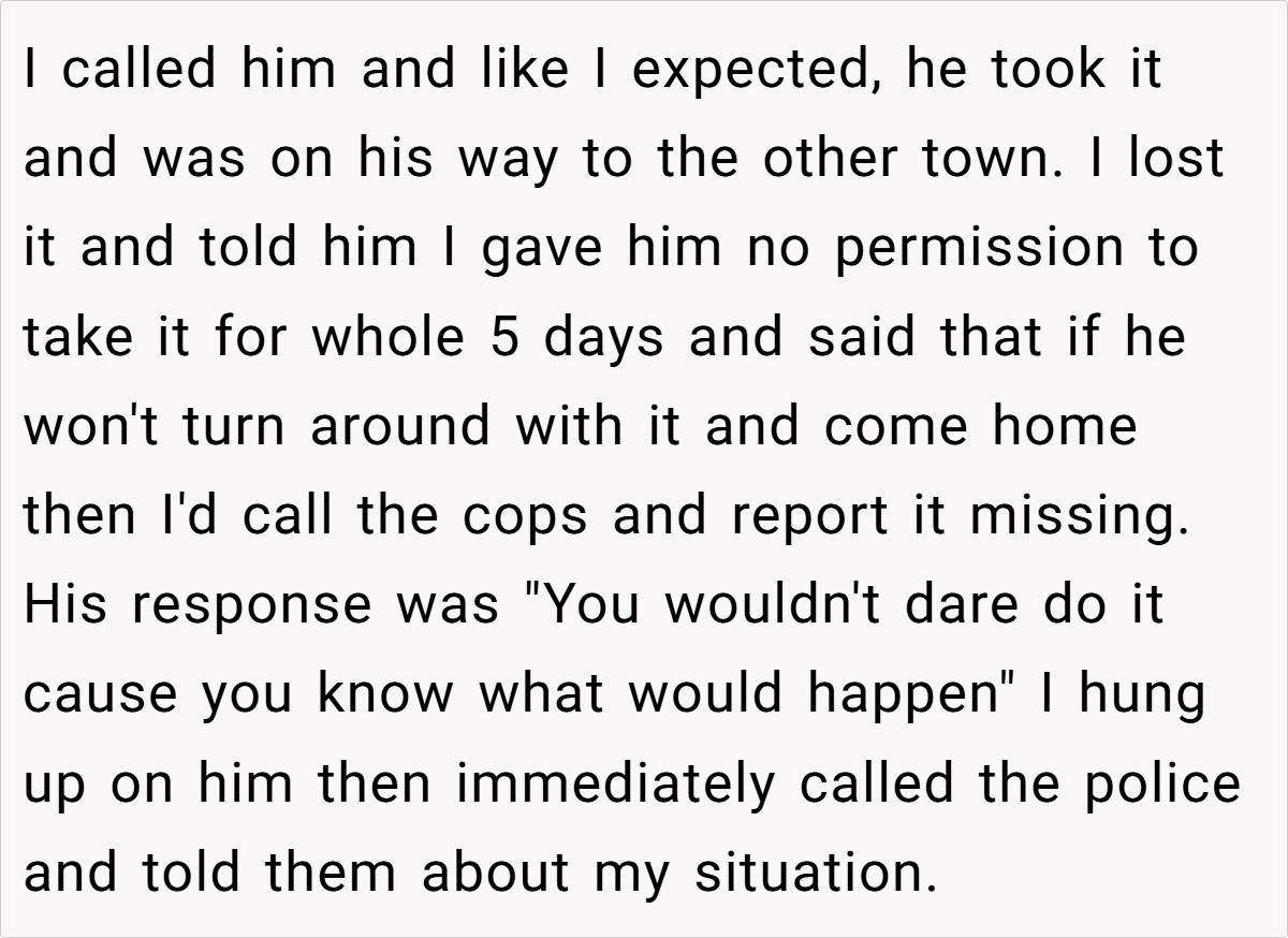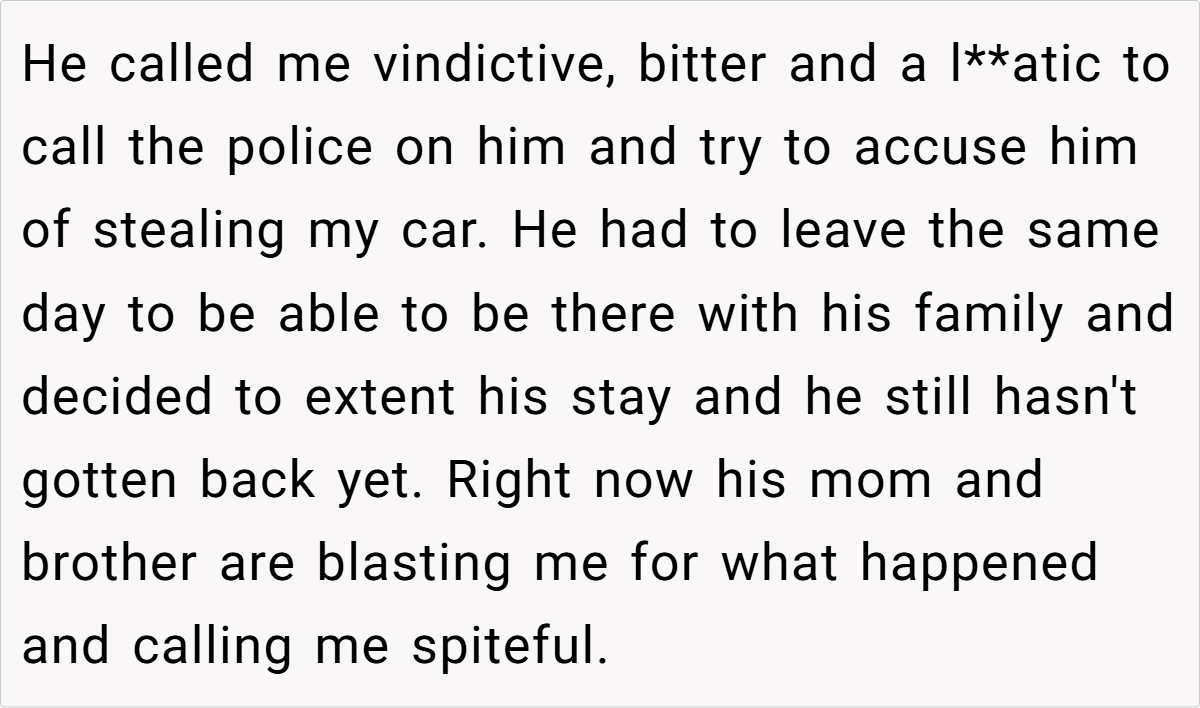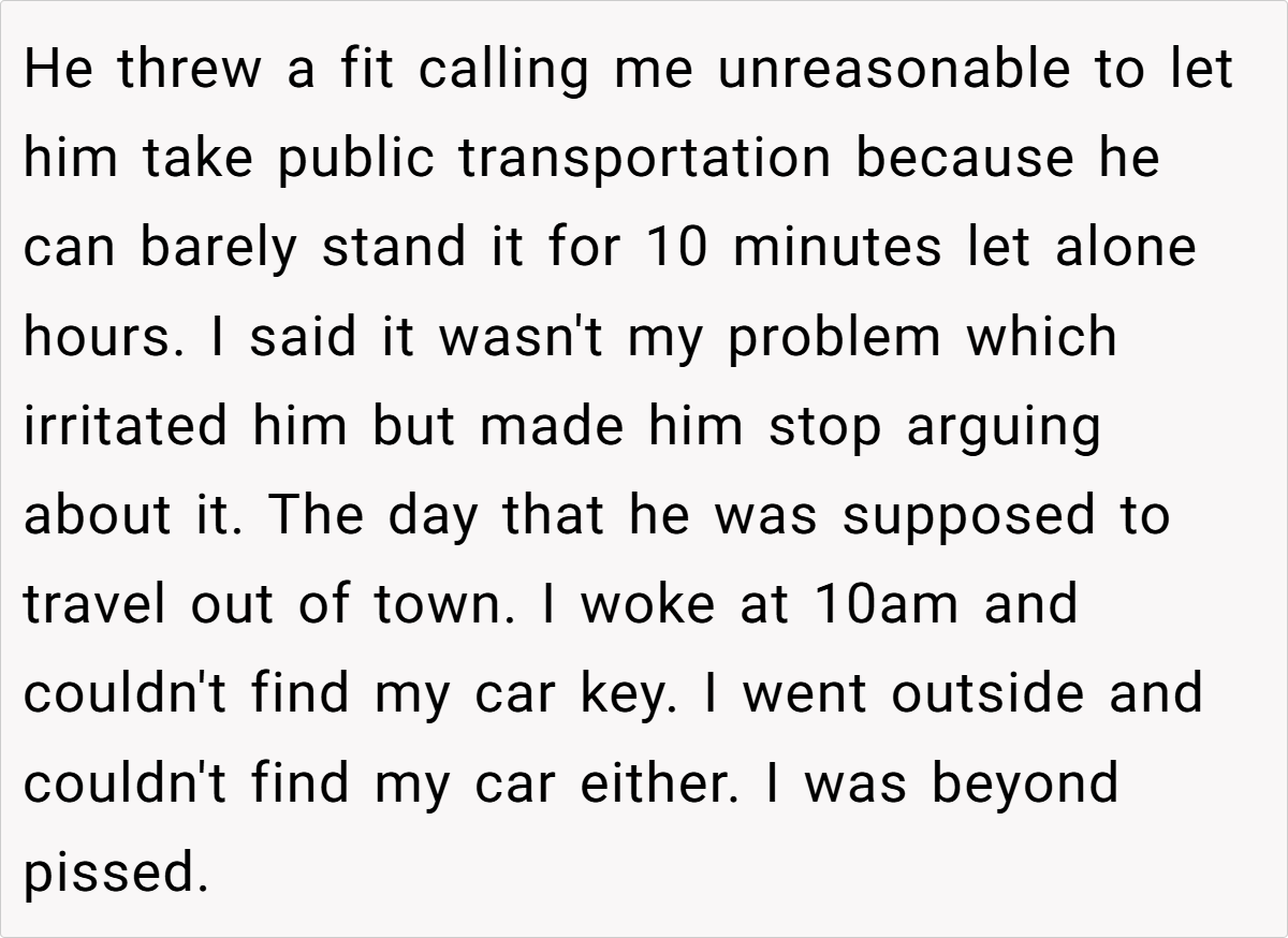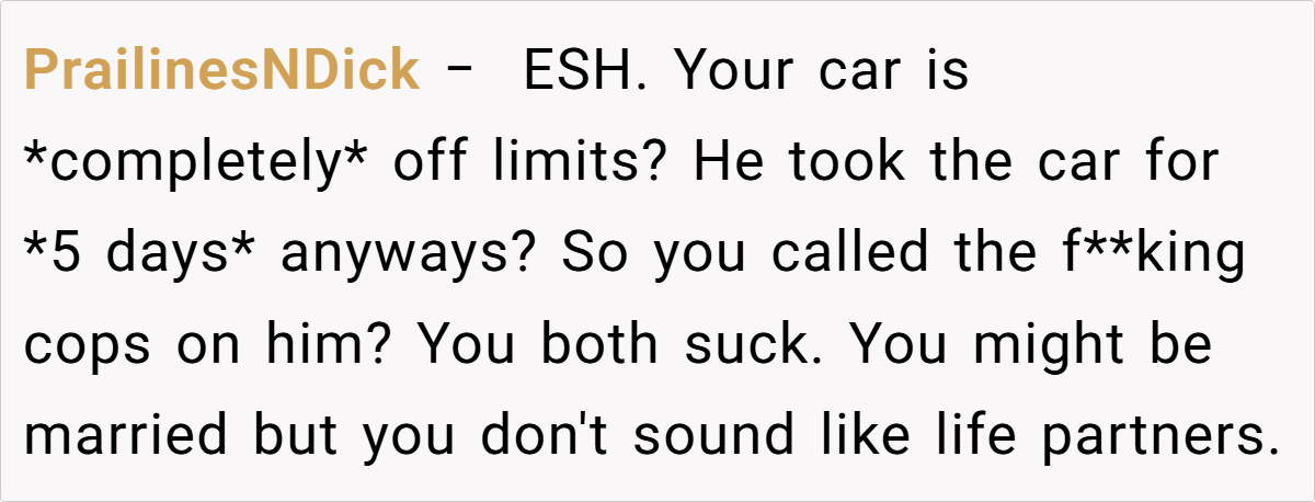 In this scenario, the wife’s decision to firmly declare her car off limits was rooted in a longstanding concern about her husband’s driving skills and the stress of his commute. Her boundary was clear: her car was not a shared commodity. However, the husband’s unilateral decision to take the car—regardless of his need for transportation—ignited a conflict that quickly escalated beyond the realm of simple disagreement. His actions not only undermined her authority over her own property but also touched on deeper issues of respect and partnership.