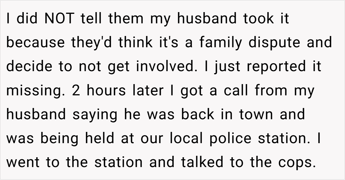 When the wife discovered her car key was missing and learned that her husband had taken the vehicle without permission, she reached a breaking point. Her decision to report the car as missing was driven by a desire to enforce her boundary and to signal that unilateral decisions have consequences. Unfortunately, this move led to an unexpected confrontation with law enforcement and further inflamed tensions at home.