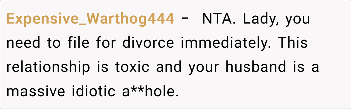Some commenters argue that the wife’s actions were justified in light of her clearly stated boundary, while others feel that both partners acted immaturely. Opinions range from outright calls for divorce to critiques of each party’s decision-making, reflecting the complexity of the issue.