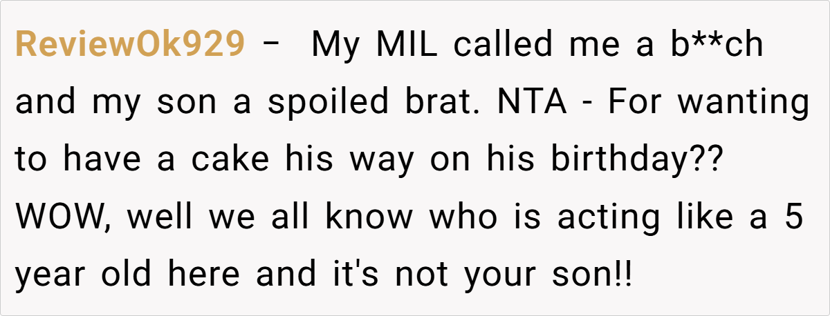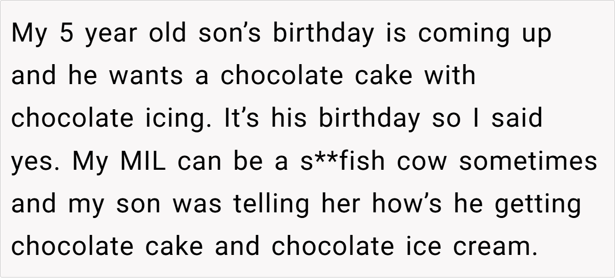 Brief Lead-in: The original post describes how, for a 5‑year‑old’s birthday, his simple desire for a chocolate cake with chocolate icing became a battleground for conflicting ideas about respect and celebration. When his MIL argued that the cake should suit everyone’s taste, his parents explained that the birthday child gets to choose his cake. After MIL hurled insults and demanded an apology note from the child, the parents drew a firm line—declaring that it was her choice to miss the party if she couldn’t respect his wishes.