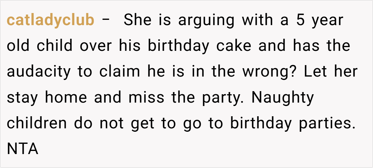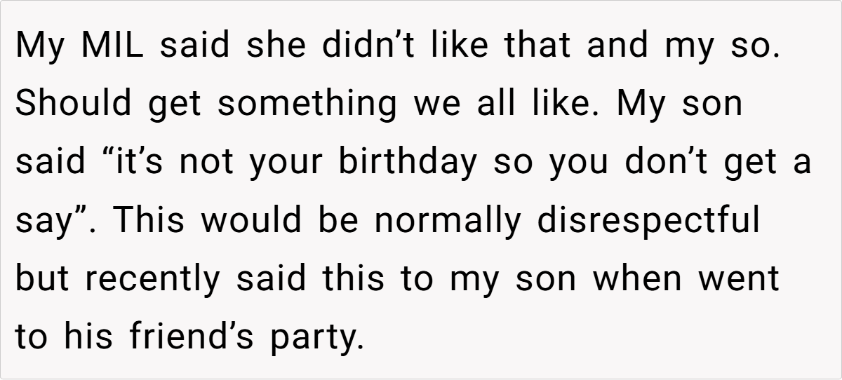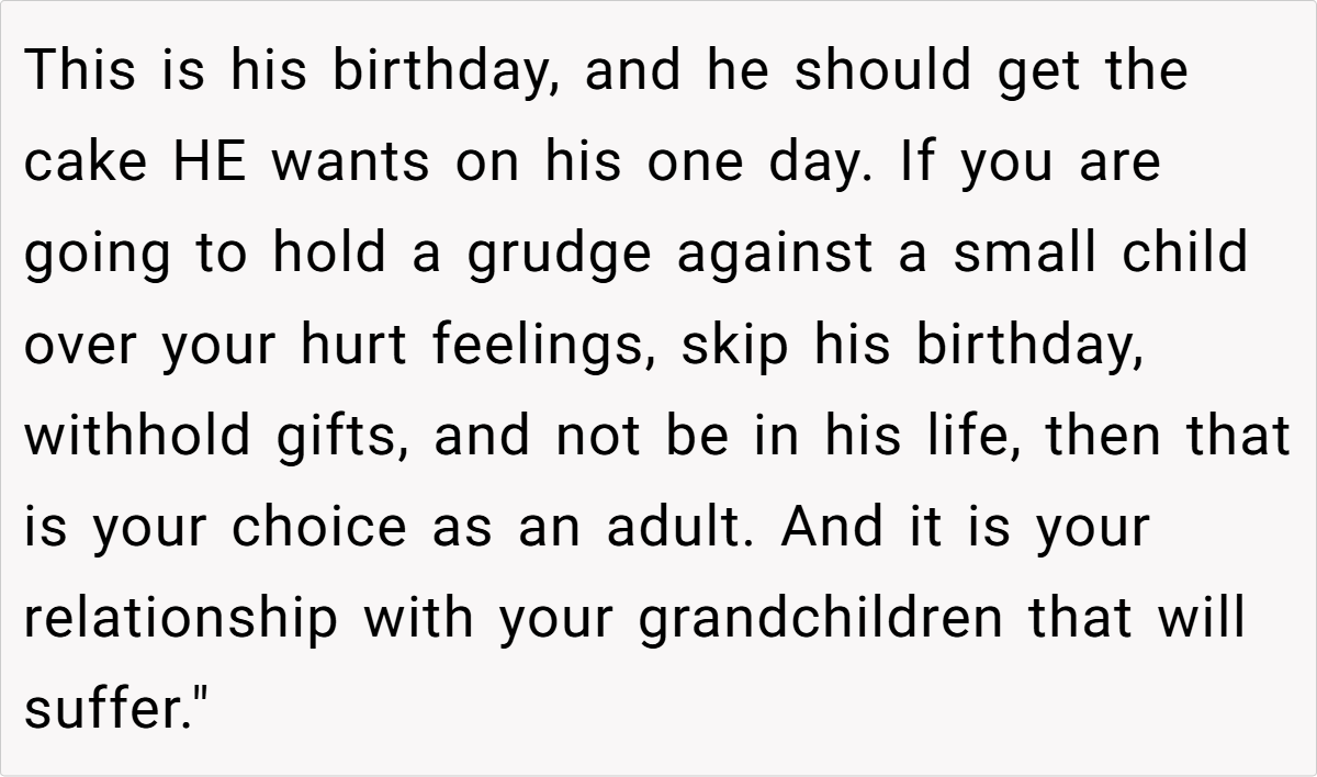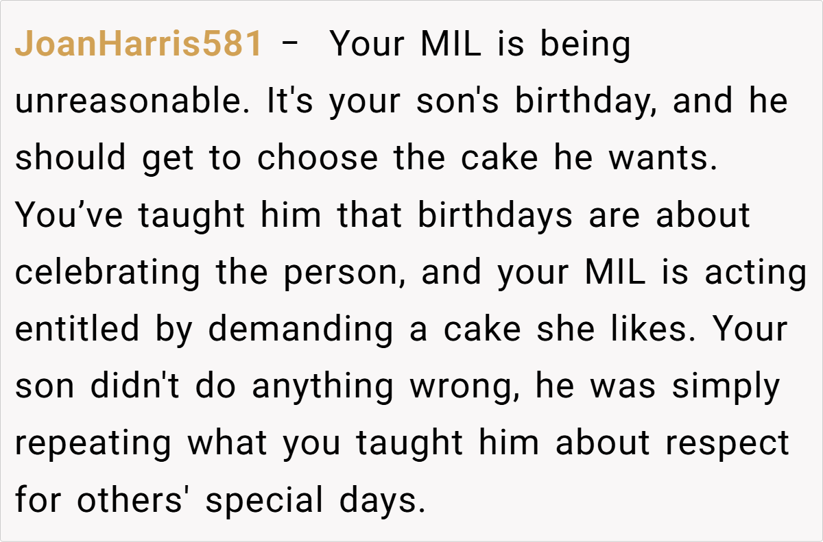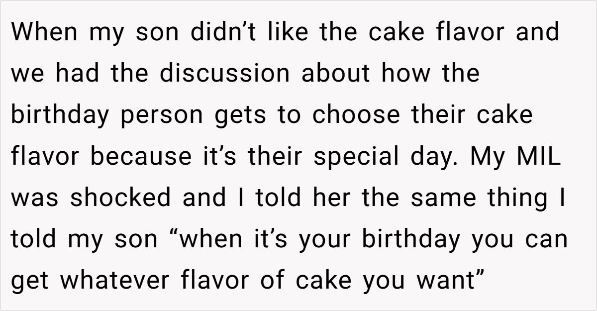 However, things quickly escalated when his grandmother (MIL) objected, insisting that the cake should be something everyone likes. The child even put her in her place by saying, “It’s not your birthday so you don’t get a say,” echoing a similar remark he’d made at a friend’s party.