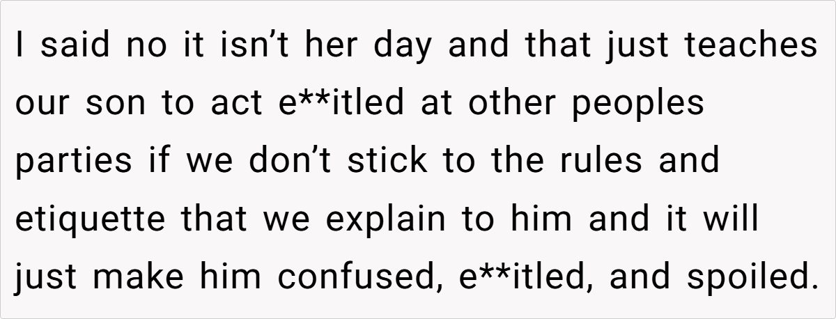 When it comes to enforcing boundaries around a child’s special day, experts say that consistency and respect for the child’s voice are paramount. Parenting expert Dr. Laura Markham explains, “When you honor your child’s wishes on their birthday, you affirm their individuality and help them understand that their feelings matter. It’s about setting clear boundaries and reinforcing that not everyone is entitled to impose their preferences on someone else’s celebration.” This sentiment is echoed by many child development specialists who stress that a birthday is a unique moment for a child to experience both decision-making and responsibility.