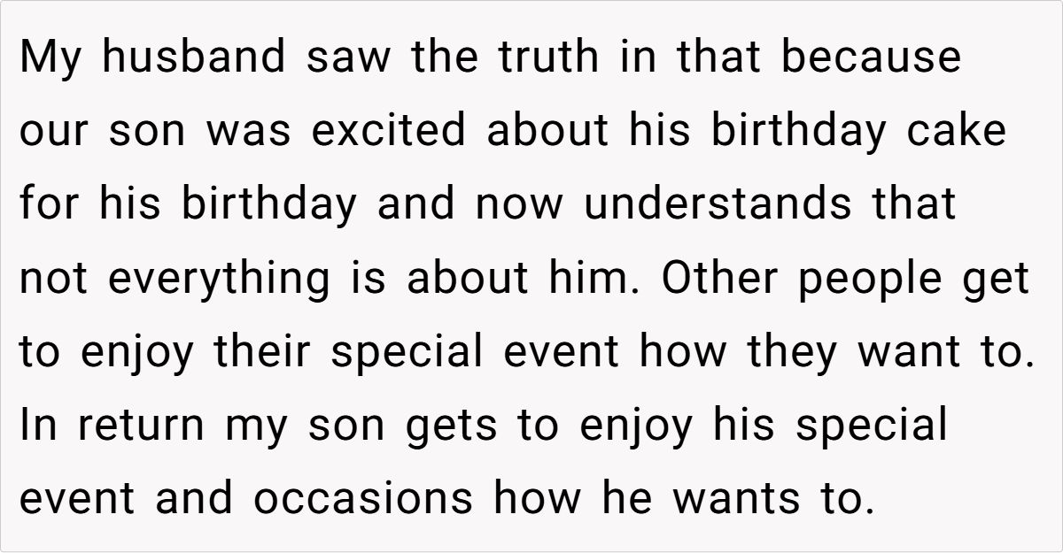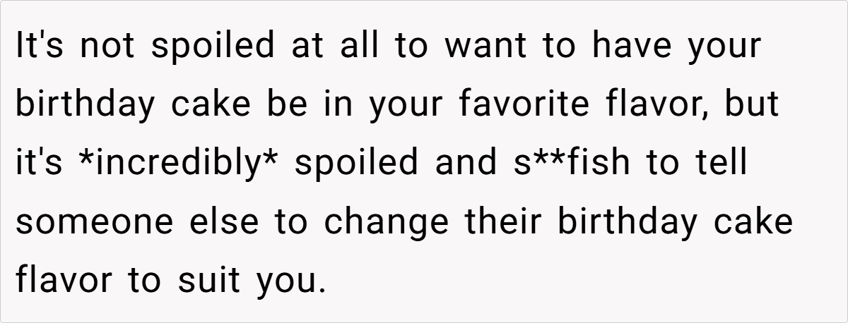 Ultimately, this story isn’t just about cake flavors—it’s about respecting a child’s right to celebrate in their own way. By insisting that birthdays remain about the birthday person, the parents are teaching an important lesson about boundaries and individuality.