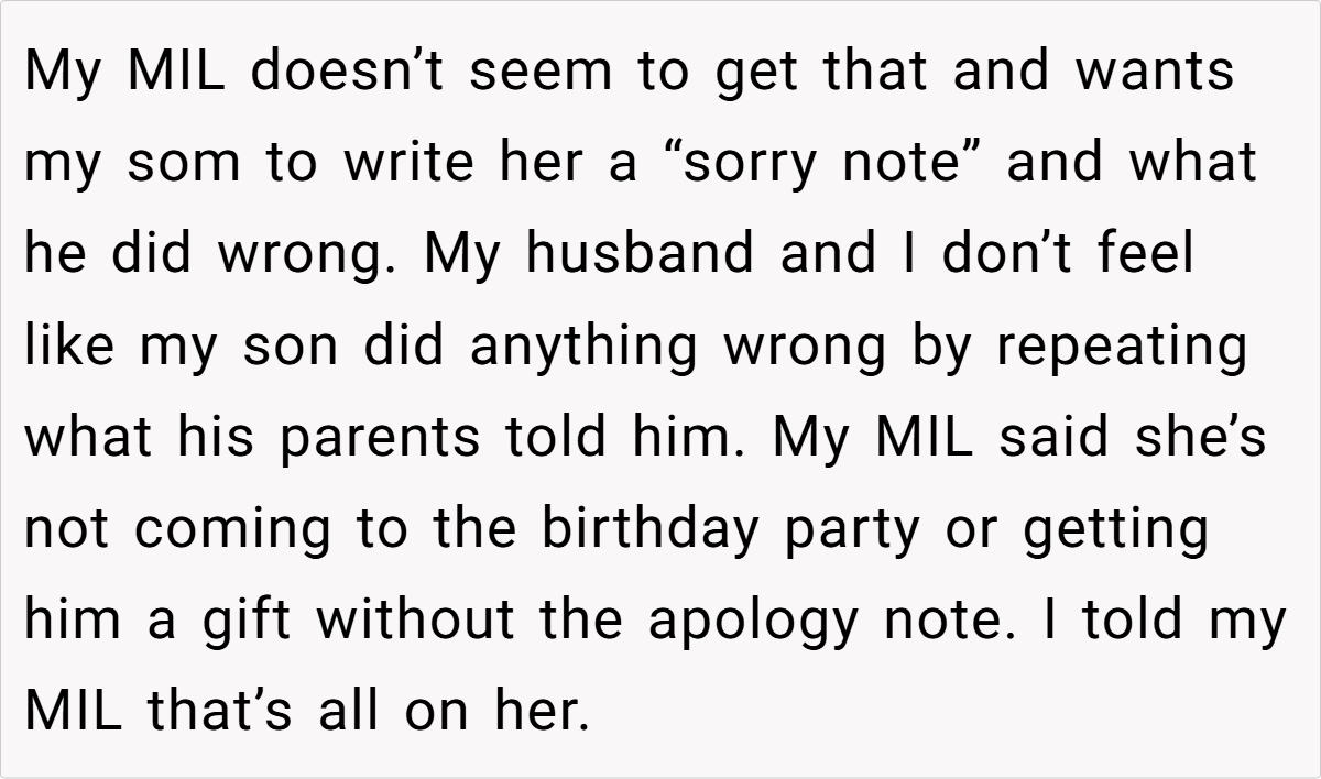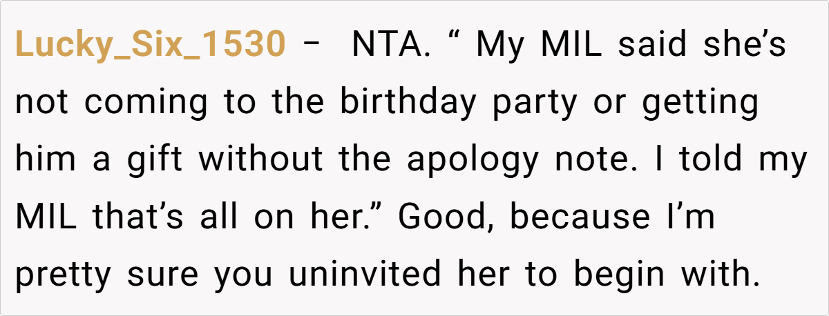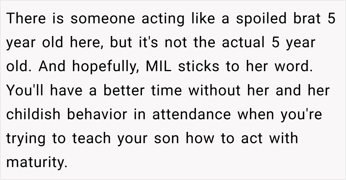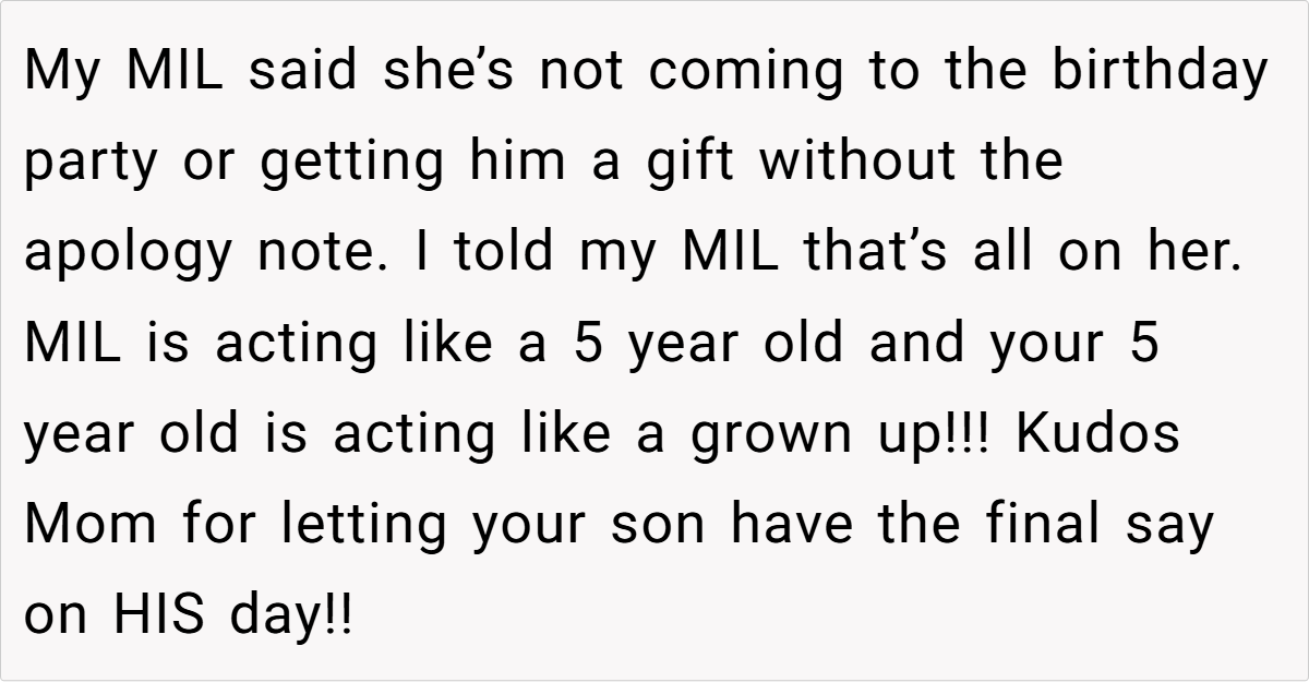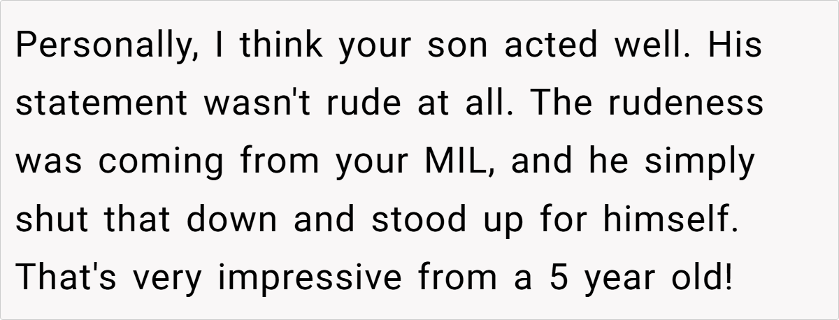 Many noted that the 5‑year‑old’s remark was not rude at all, but a simple echo of what his parents taught him about ownership of his day. One commenter even quipped that if MIL wants a “sorry note,” she should be the one apologizing for acting like a spoiled 5‑year‑old herself!