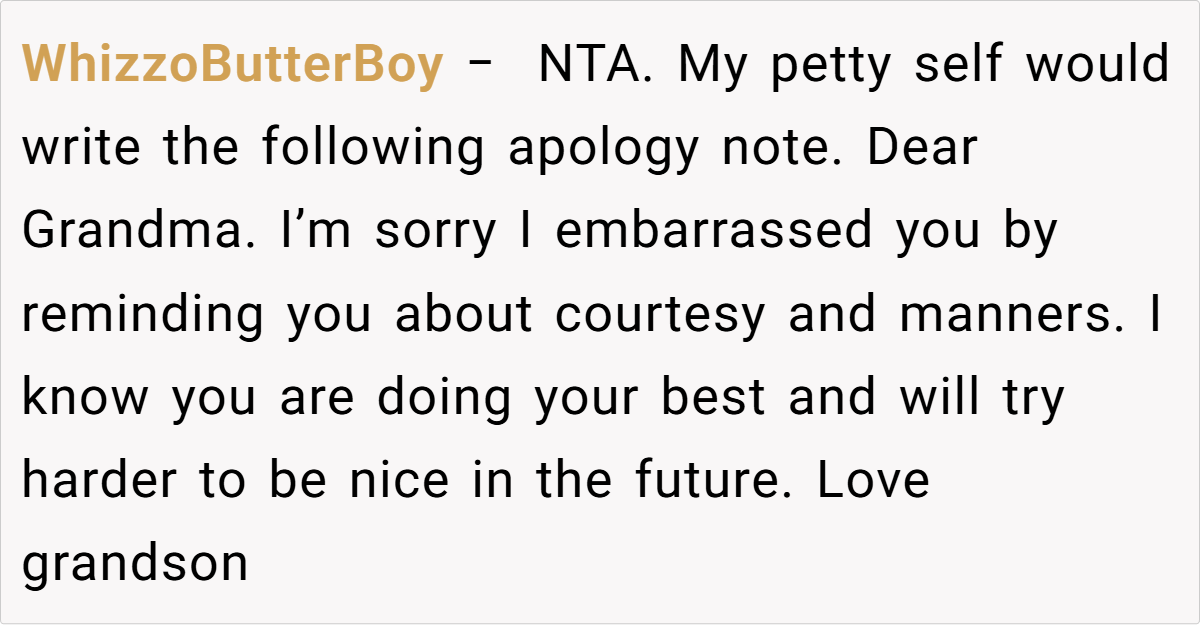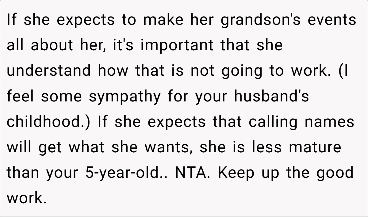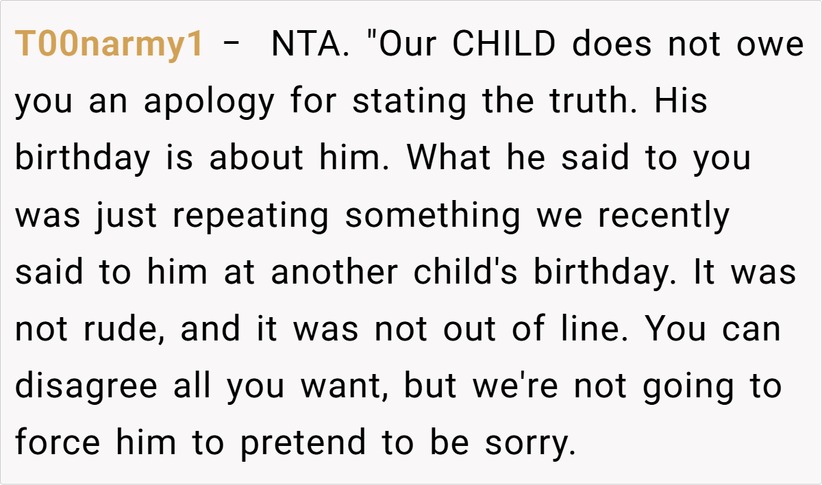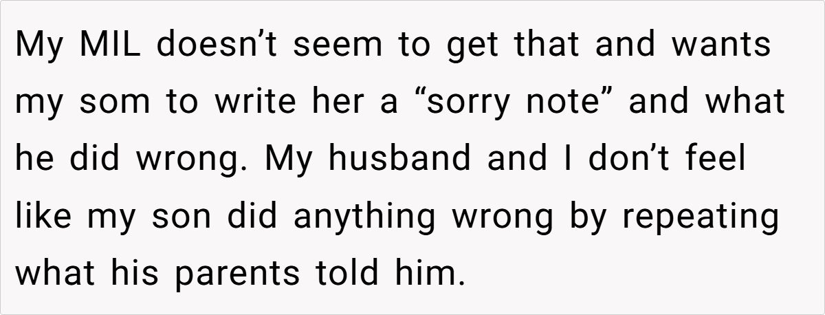 Many noted that the 5‑year‑old’s remark was not rude at all, but a simple echo of what his parents taught him about ownership of his day. One commenter even quipped that if MIL wants a “sorry note,” she should be the one apologizing for acting like a spoiled 5‑year‑old herself!