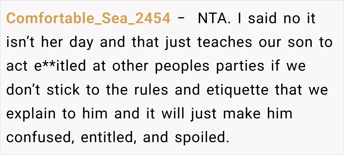 This approach not only reinforces the child’s self-esteem but also prevents the mixed messages that can arise when adults overstep into a child’s world. In a broader sense, experiences like these help children learn that the rules differ based on context—what works for an adult’s celebration does not automatically apply to a child’s milestone. The parents’ decision in this case, therefore, is less about pettiness and more about teaching an important life lesson: that every individual deserves to have their own special day, free from undue interference or contradictory expectations.