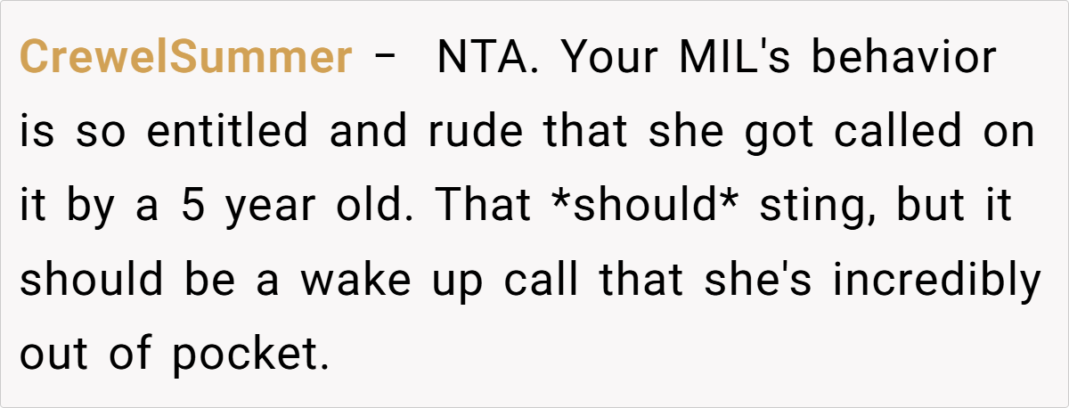 In a display of both humor and fierce support, Reddit commenters took to the thread with reactions ranging from admiration for the child’s assertiveness to outrage over MIL’s behavior.