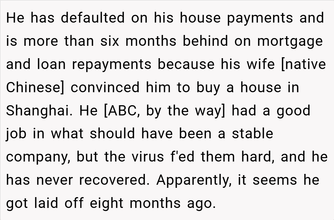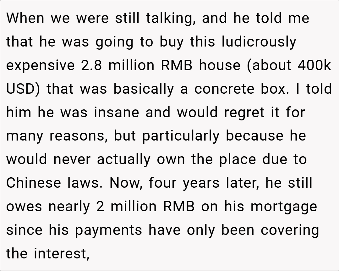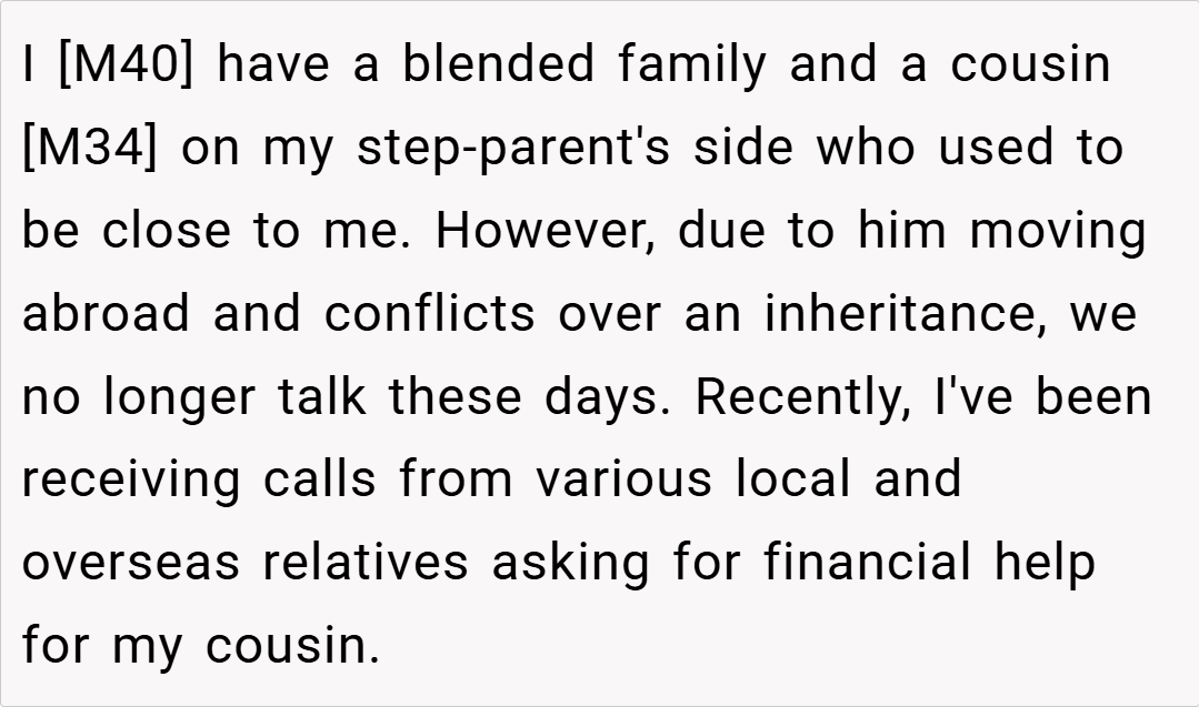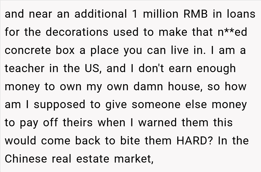 As mortgage payments pile up and his loans spiral out of control, our narrator finds himself caught in a tug-of-war between family duty and financial self-preservation. Despite repeatedly warning him that this concrete box was a recipe for disaster under Chinese law, the cousin continues to face mounting debts. Now, with relatives both near and far demanding assistance, our narrator is left wondering: Will he be the asshole if he refuses to help fund a mistake he warned about from the start?