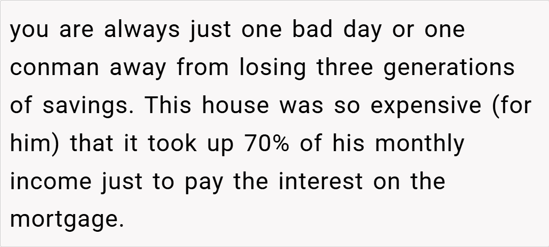 In our case, the cousin’s decision to invest 70% of his monthly income just to cover interest on a house he may never fully own fits this warning all too well. The financial strain is not just about numbers; it’s about the impact on family dynamics too. Our narrator, who barely manages to save enough for his own future plans like buying a new car, finds himself pressured to bail out someone whose poor decisions he foresaw.