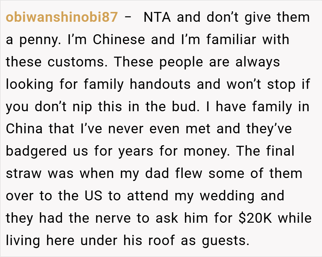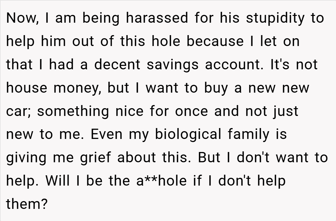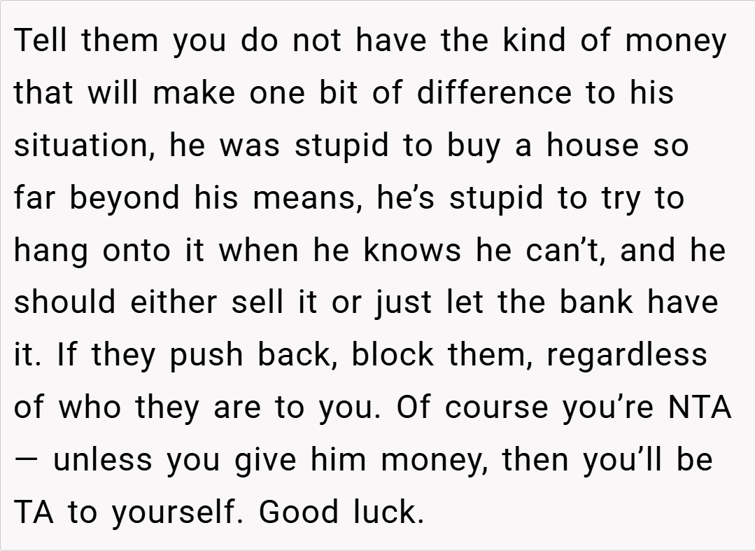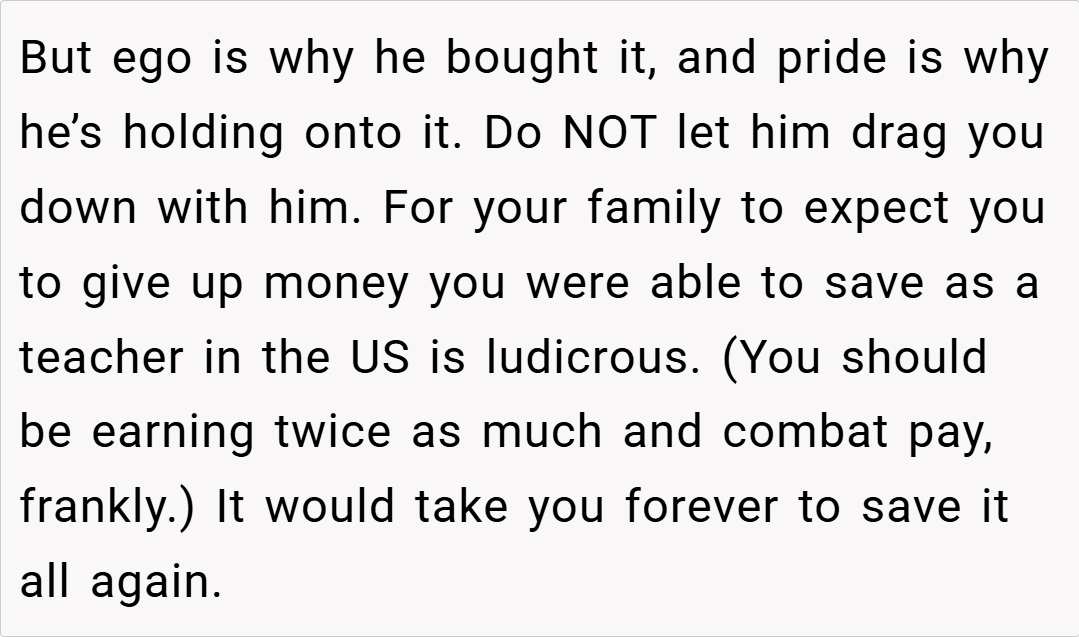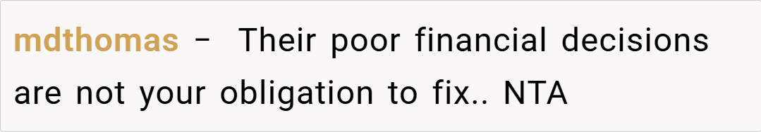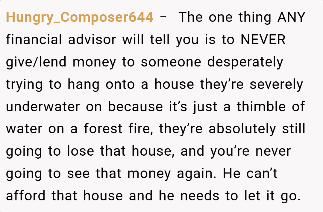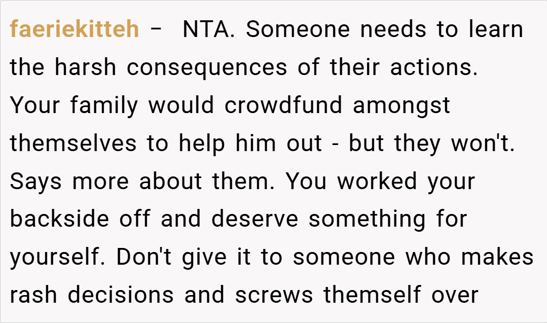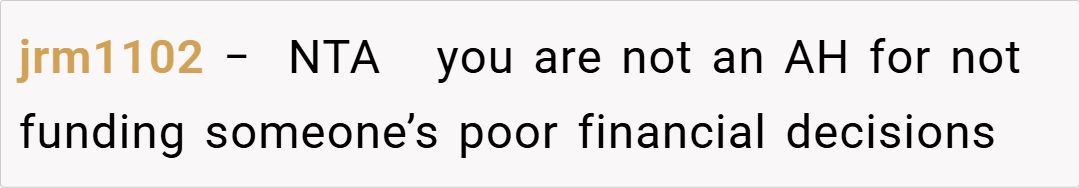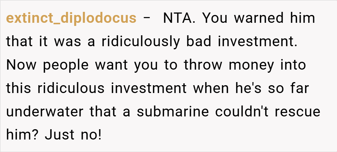 By holding firm and refusing to fund a bad investment, he’s not only protecting his financial future but also reinforcing a valuable lesson: financial responsibility cannot be compromised by familial guilt. It’s a hard truth that sometimes, no amount of family pressure can justify bailing someone out of a mistake they made themselves.