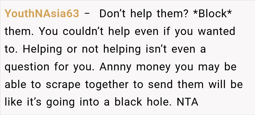 The Reddit community has had plenty to say about this financial fiasco. Many users agree that bailing out a relative who made such a reckless decision is a recipe for future headaches. One user pointedly stated, “Don’t help them? Block them. You couldn’t help even if you wanted to.” Others emphasized that the cousin’s decision was bound to backfire, noting that family money should never be used to prop up poor investments.