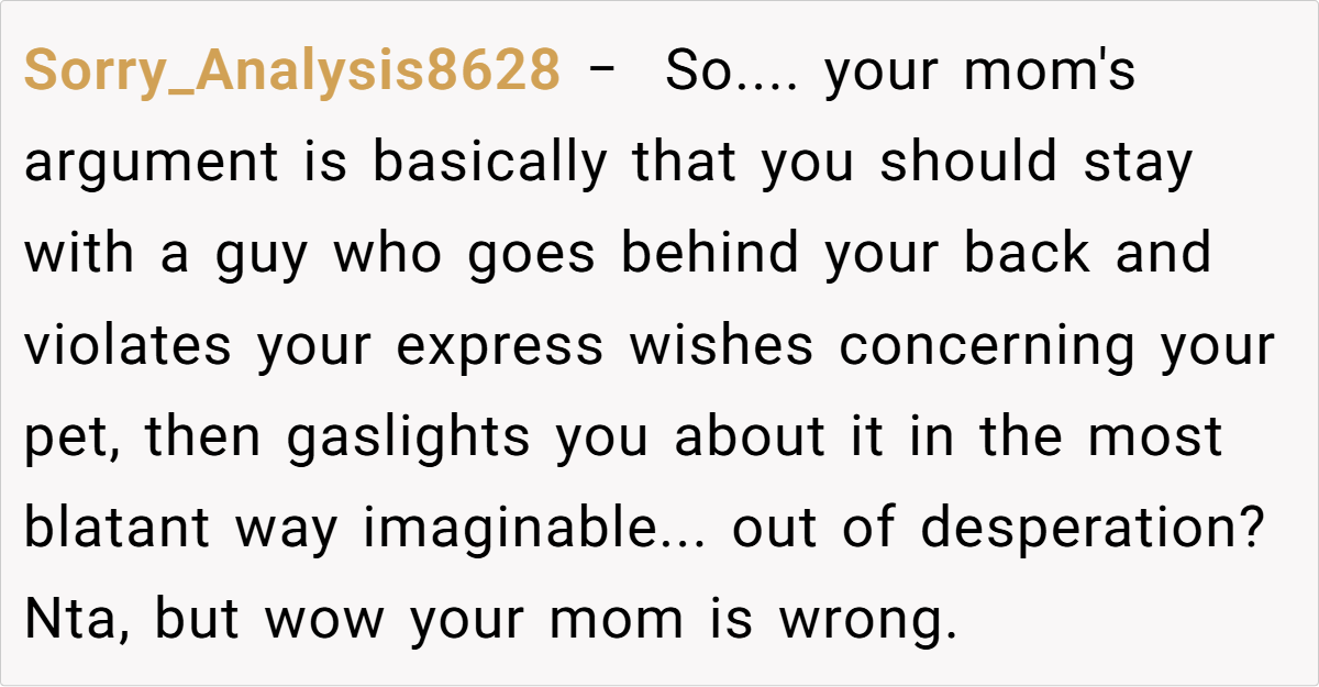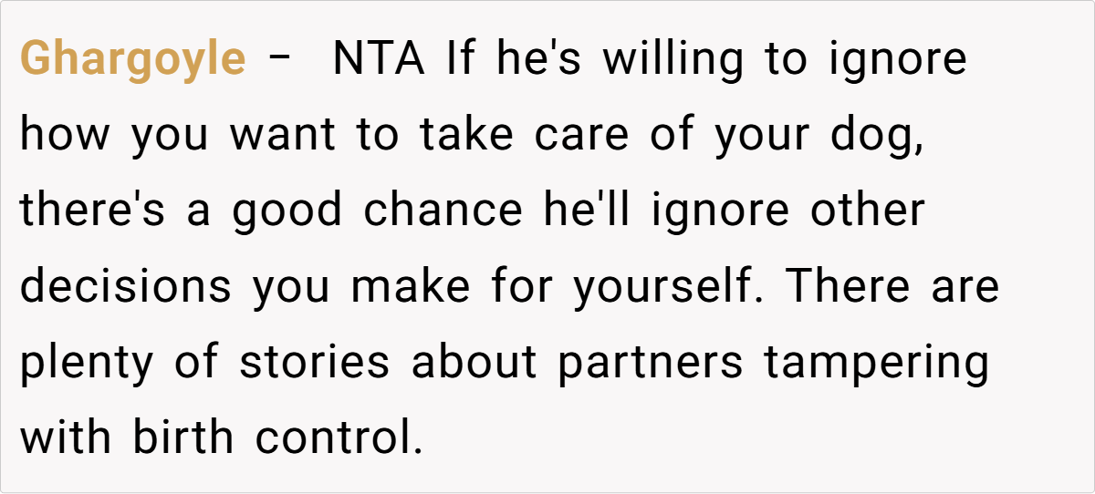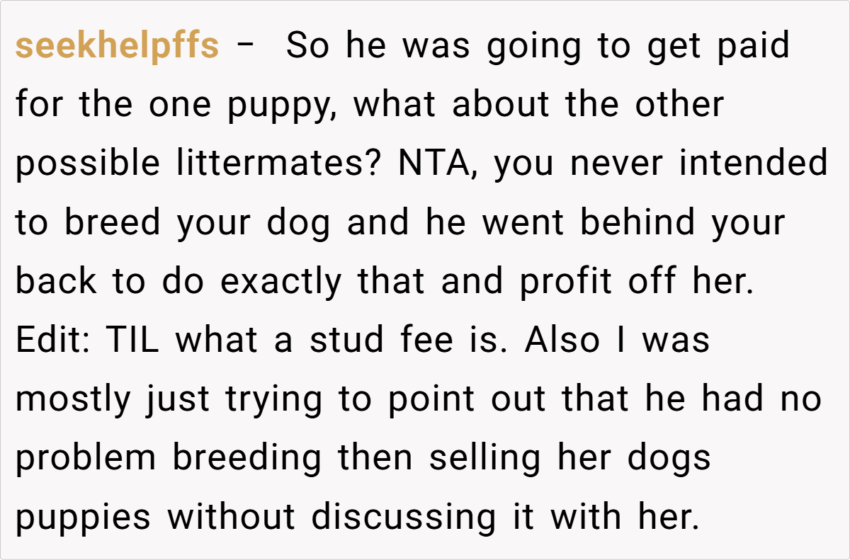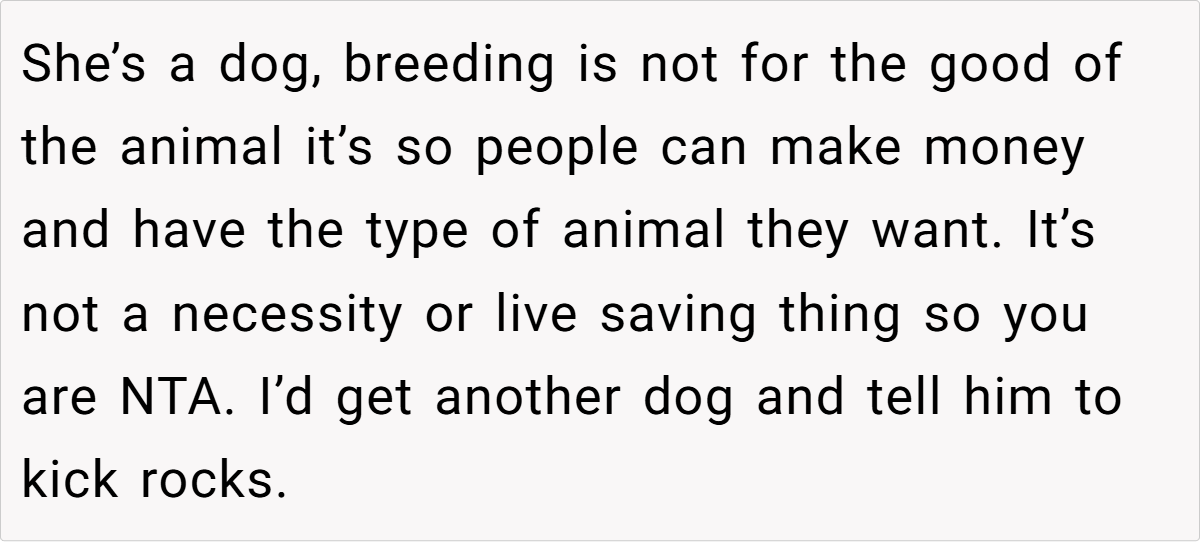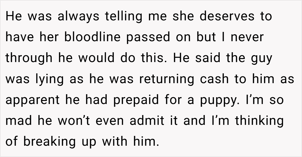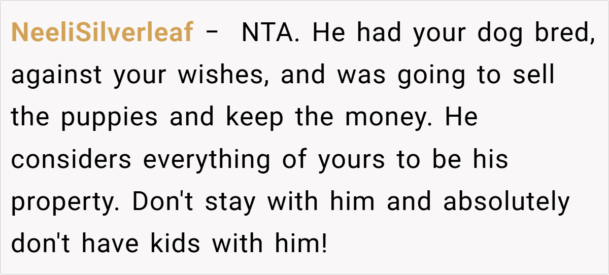 The Reddit community has reacted with a resounding outcry against the boyfriend’s actions. Many commenters condemned his secret breeding of her dog, labeling it a betrayal of trust and a clear sign of disrespect. Some urged her to break things off immediately, while others warned against ignoring the red flags for the sake of convenience or societal pressures.
