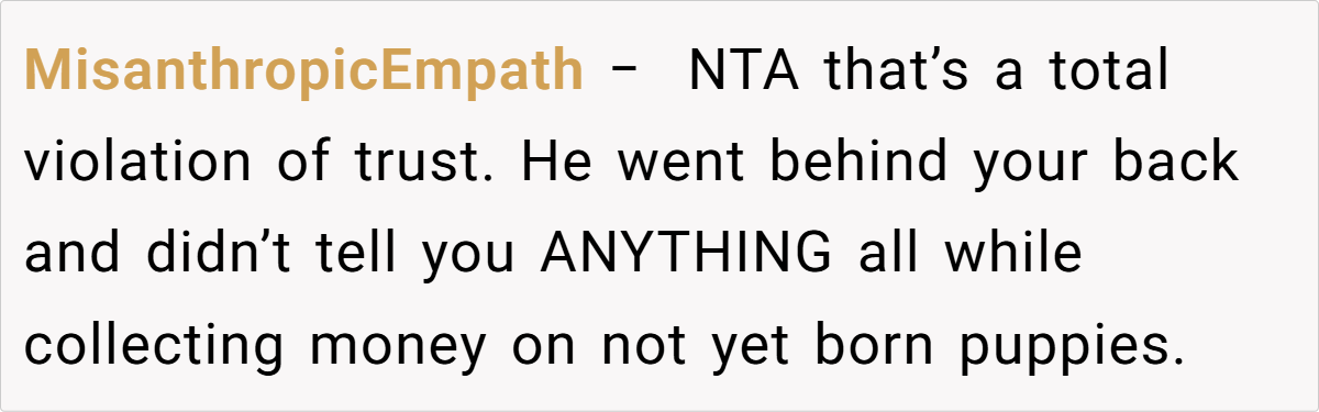 This scenario also brings to light issues of control and the misuse of shared assets—here, the dog was treated less as a beloved companion and more as a commodity for profit. When one partner acts unilaterally, it can disrupt the delicate balance of power in a relationship. As relationship expert Dr. John Gottman has noted, “When one partner repeatedly violates agreed-upon boundaries, it undermines the very foundation of trust and mutual respect.” His insights remind us that such actions are often indicative of deeper relational issues that may not be easily resolved.