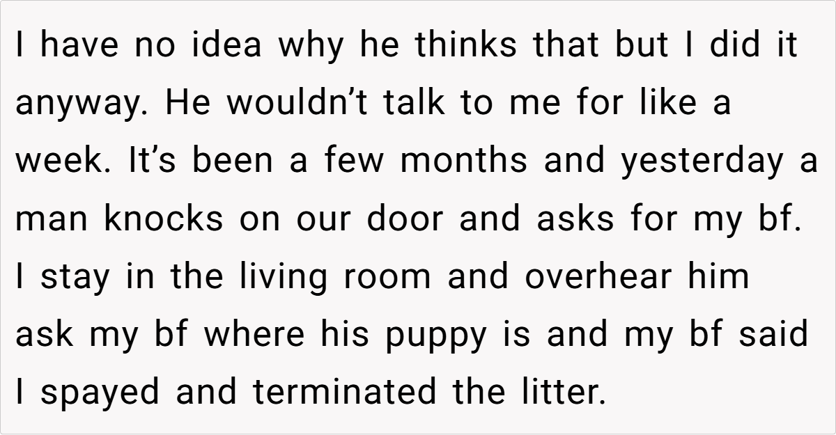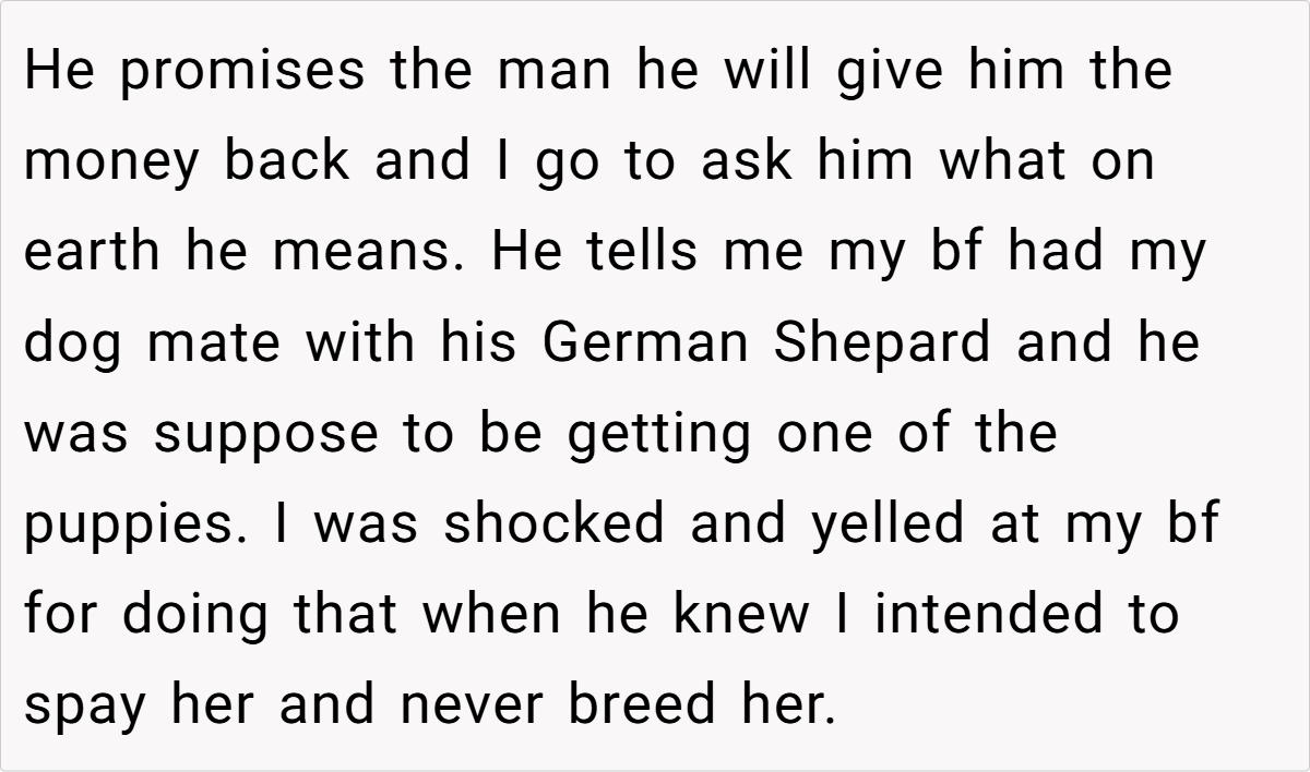 When a partner blatantly disregards agreed-upon decisions, it shatters the trust essential for any healthy relationship. In this case, the betrayal isn’t just about a pet—it’s a violation of personal autonomy and respect. Choosing to spay her dog was a well-considered decision, and her boyfriend’s secret breeding undermined that choice, creating a ripple effect of deceit and manipulation. This breach of trust can lead to long-term emotional scars that extend far beyond the pet itself.