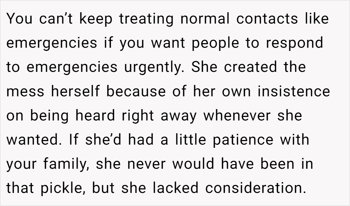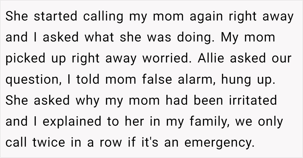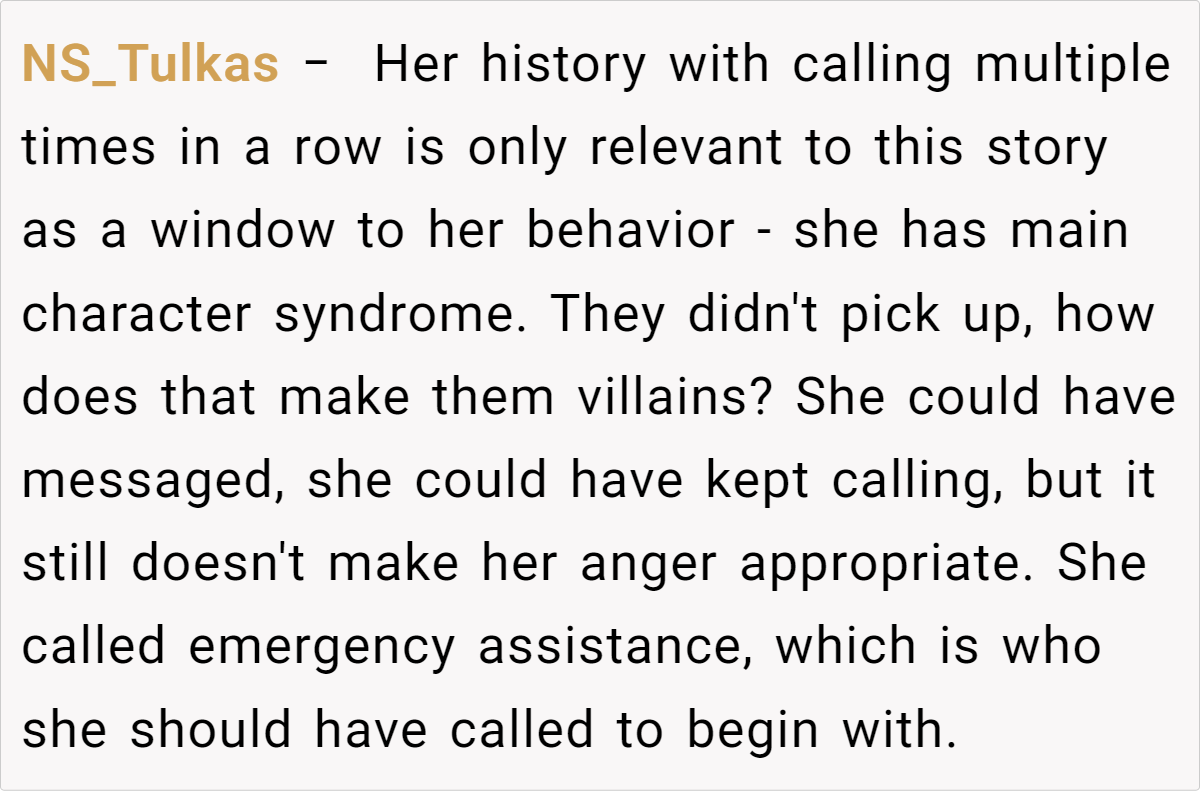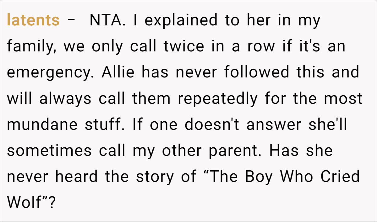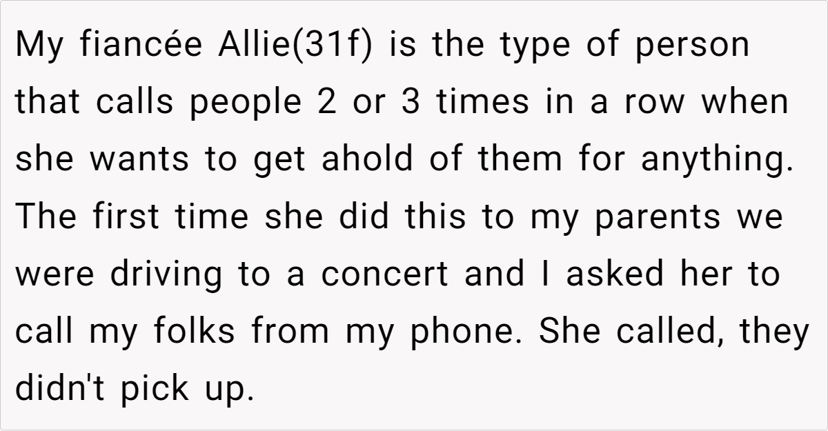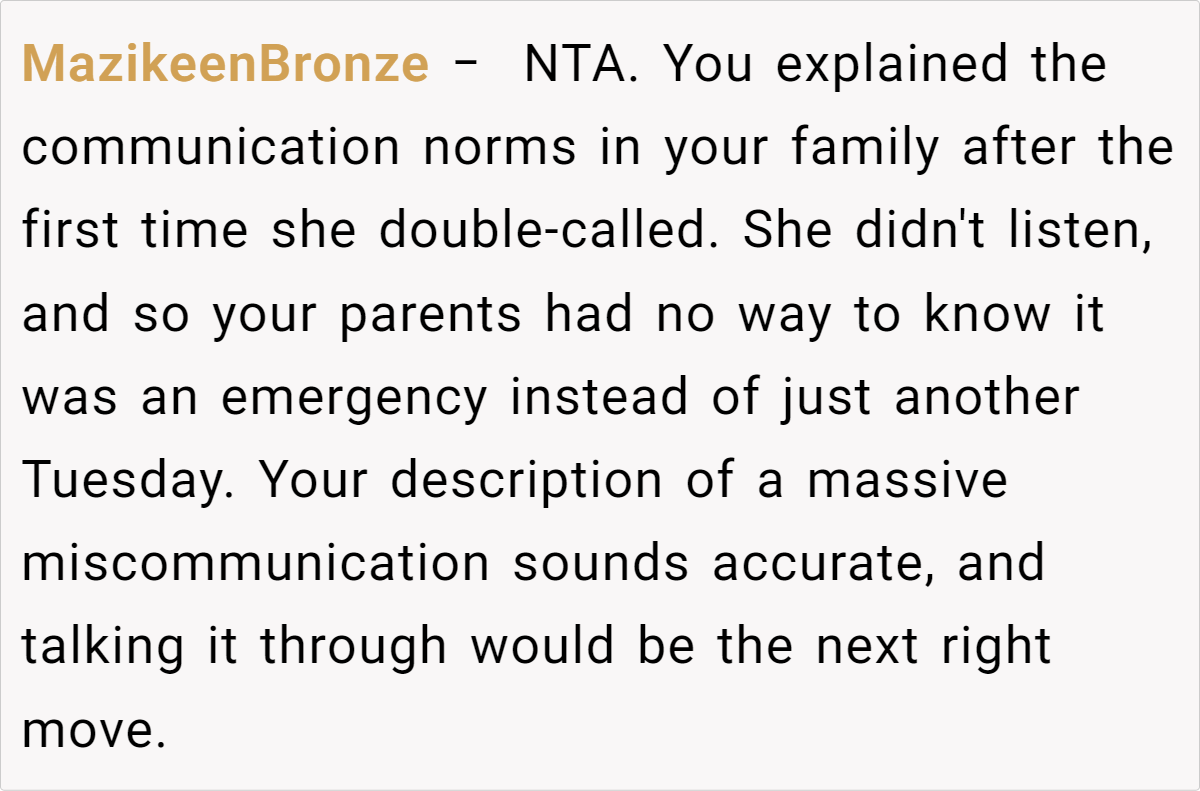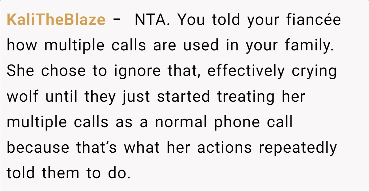 Letting your emotions guide how you respond in emergencies can sometimes lead to misunderstandings. In this story, the fiancée’s habit of calling repeatedly—a behavior she’s long been known for—clashed with a family norm of only returning calls after a couple of rings unless it’s a genuine crisis. This discrepancy in communication expectations has fueled resentment and confusion. Clearly, when different patterns of behavior intersect, what one person sees as proactive, another may interpret as excessive.