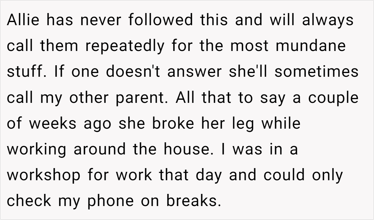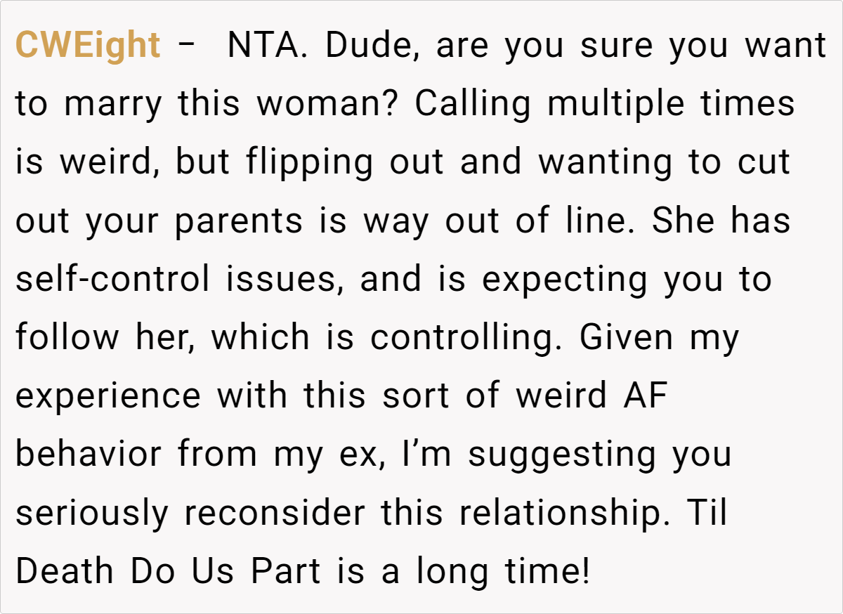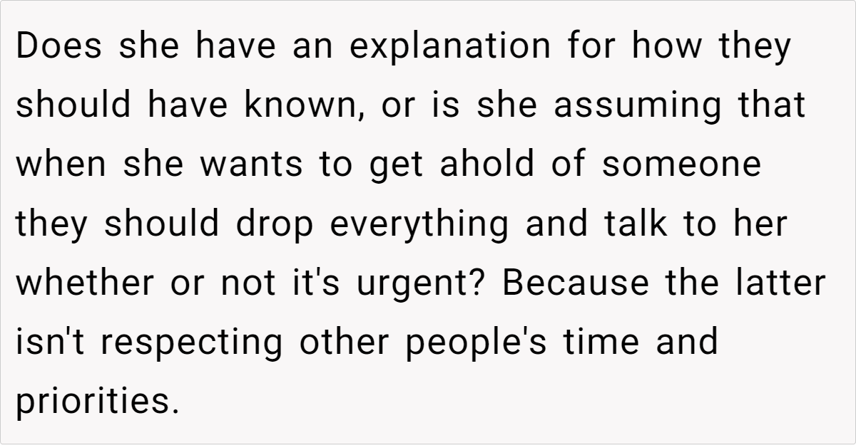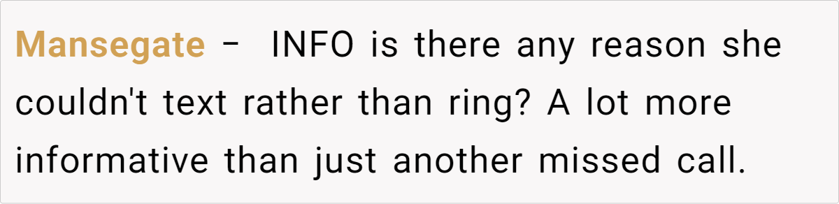 The differing expectations in this scenario highlight a broader issue in family communication—namely, that unspoken norms can lead to hurt feelings when not everyone is on the same page. For the fiancé’s parents, their typical routine of a couple of missed calls is just a normal part of their day. For her, however, every ring represents a lifeline in a moment of vulnerability.