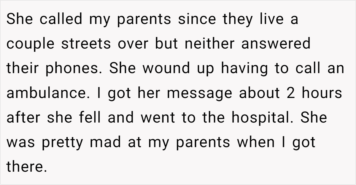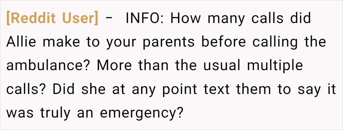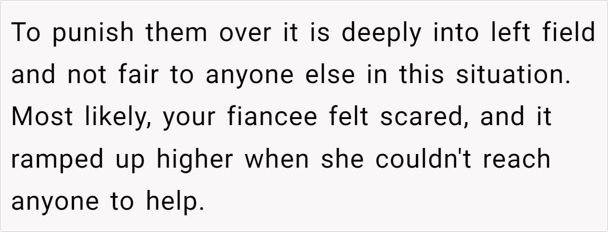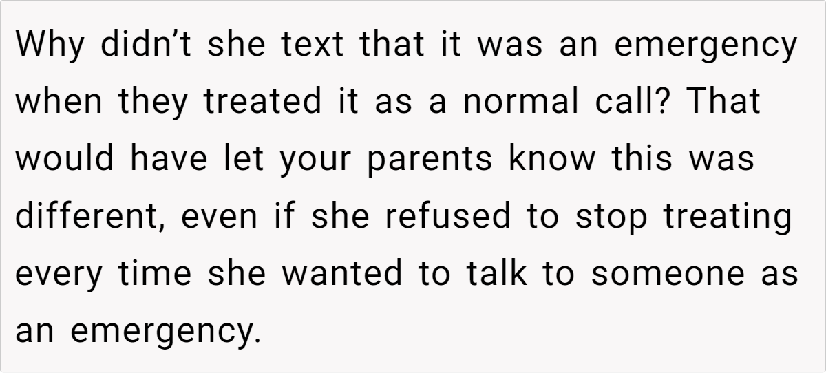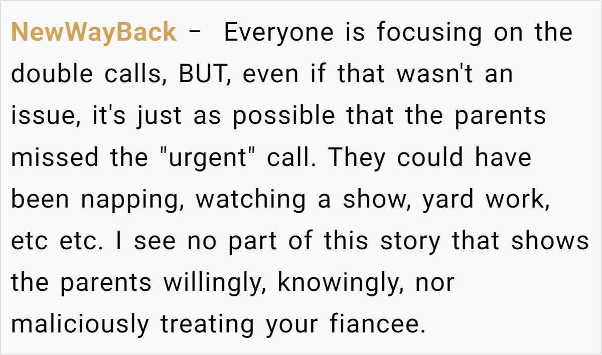 In analyzing this situation, it’s important to acknowledge that in stressful moments, people tend to perceive events through the lens of past experiences. The fiancée’s repeated calls were her way of ensuring she wouldn’t be left in distress, while the parents’ habitual response reflected their understanding of what constitutes an emergency.