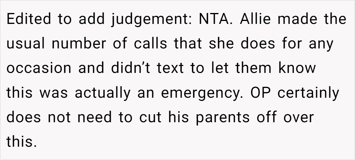 The general consensus seems to be that while the parents’ habitual delay isn’t ideal, it’s hardly malicious. Many argue that the onus was on the fiancée to communicate the urgency more clearly. The community’s responses range from empathetic understanding to outright criticism of what they see as unreasonable expectations. It appears that most agree: in times of crisis, clearer signals could prevent misunderstandings and undue blame.