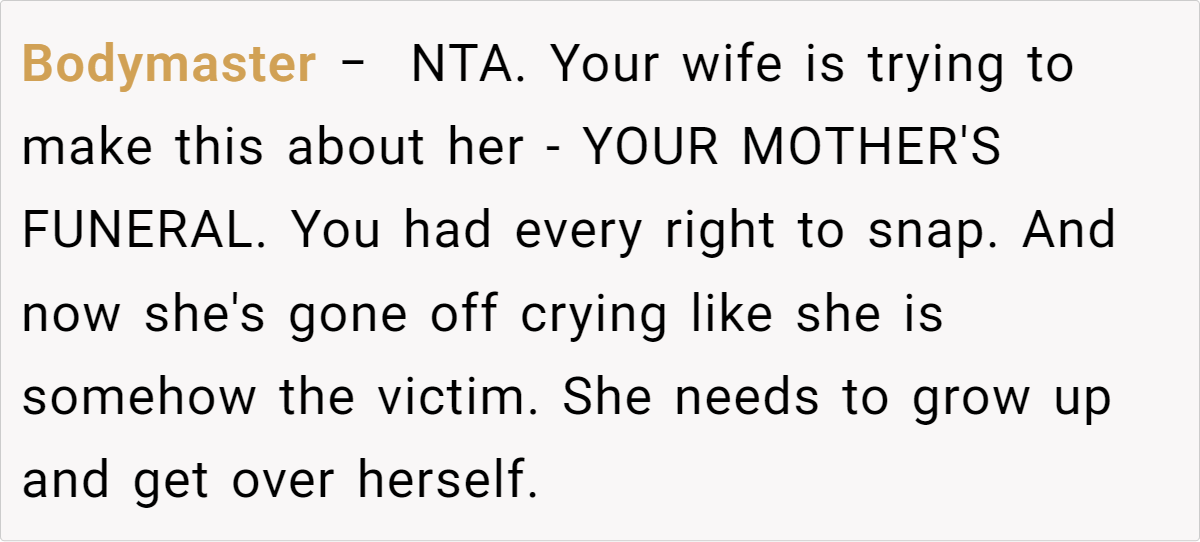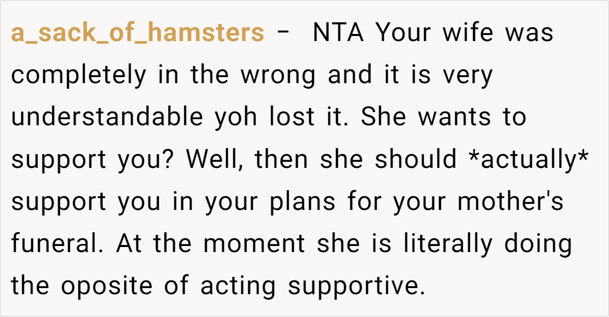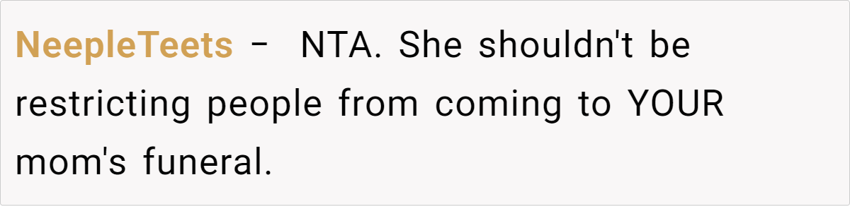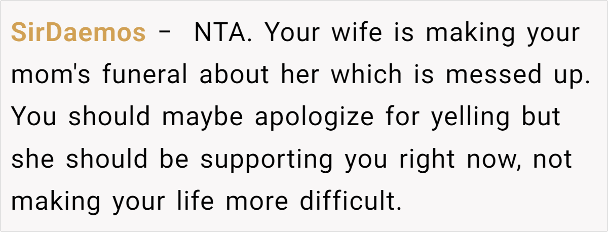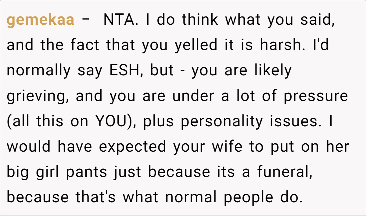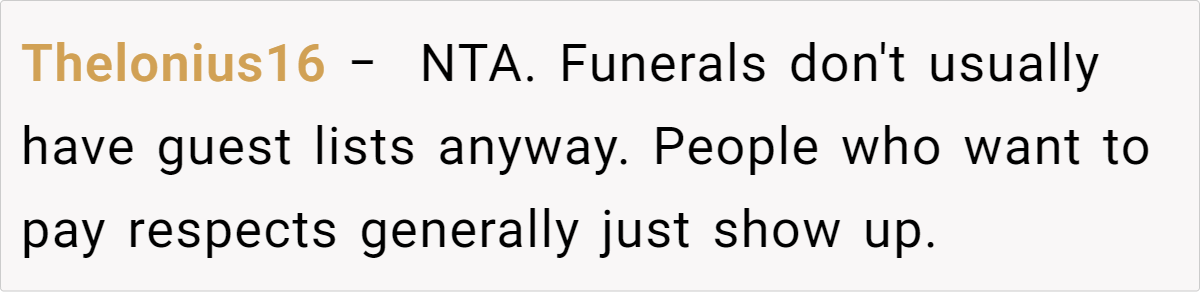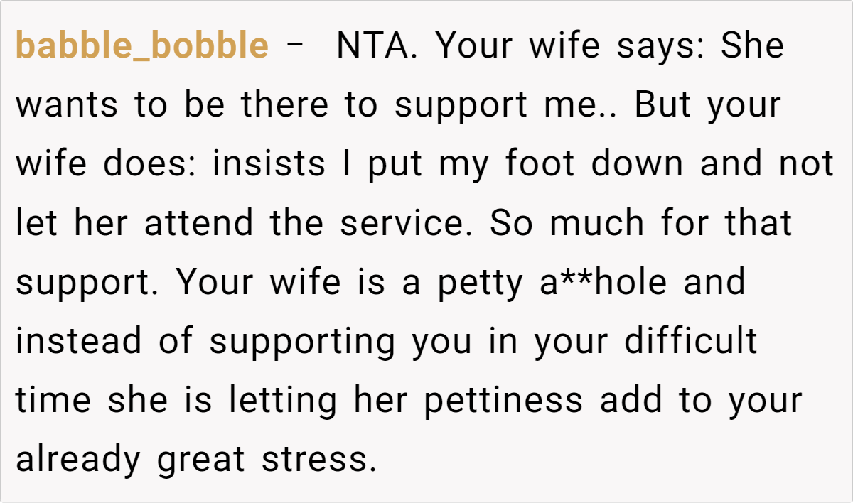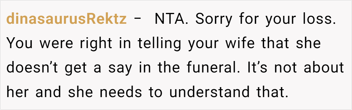 The Reddit community largely supports the husband’s decision, emphasizing that the funeral should honor the deceased’s relationships. Many commenters suggest that the wife is making the event about her personal grievances rather than supporting her husband during his time of loss. Some recommend that, while the husband’s message was valid, he should apologize for the harsh delivery but maintain his stance on the invitation.