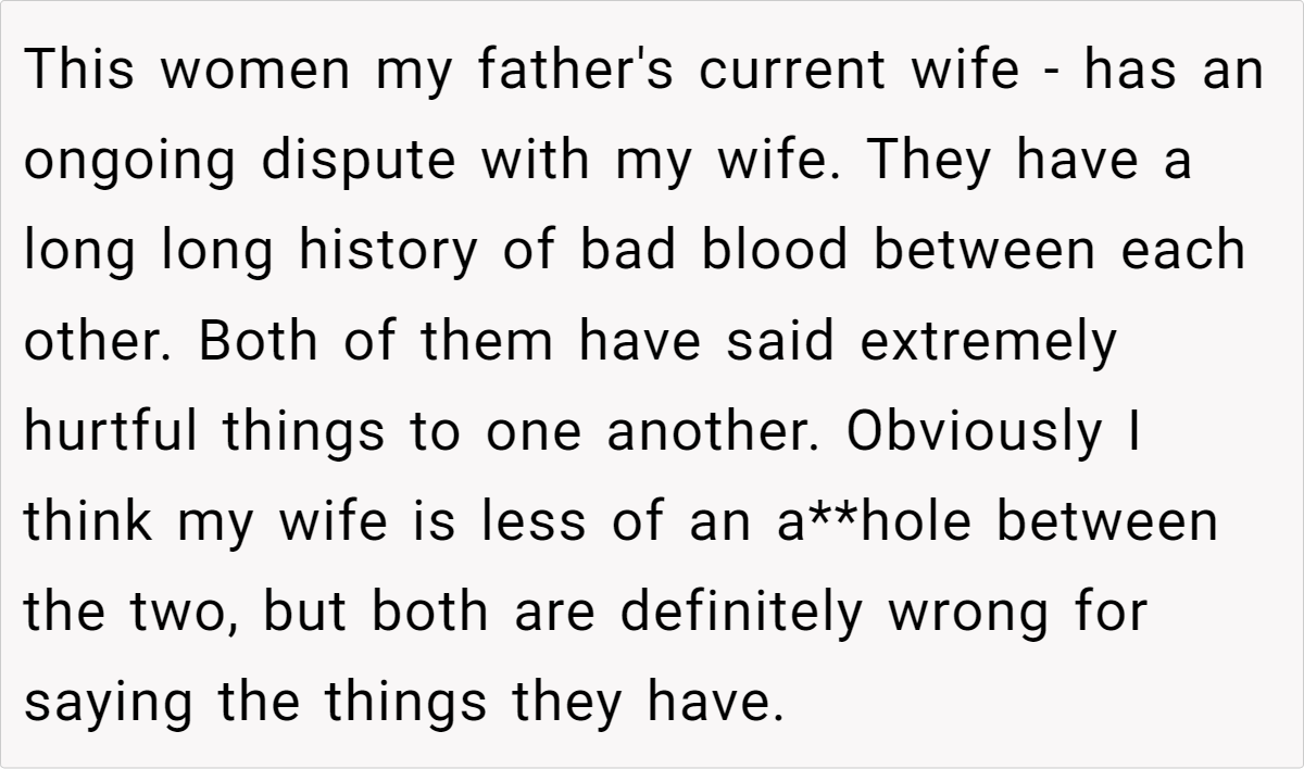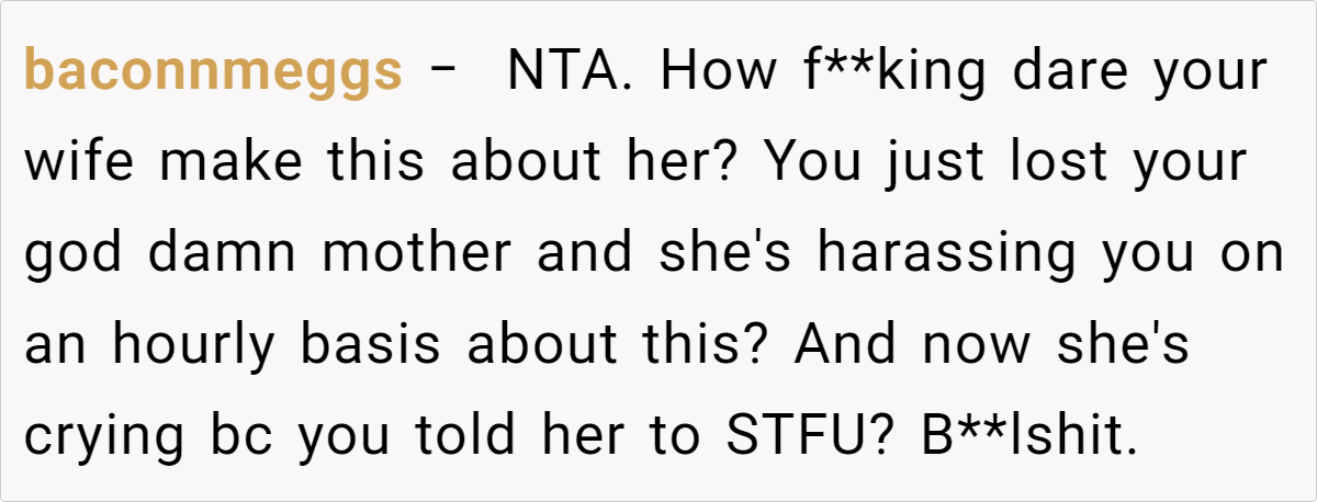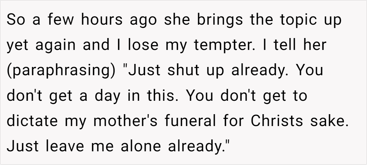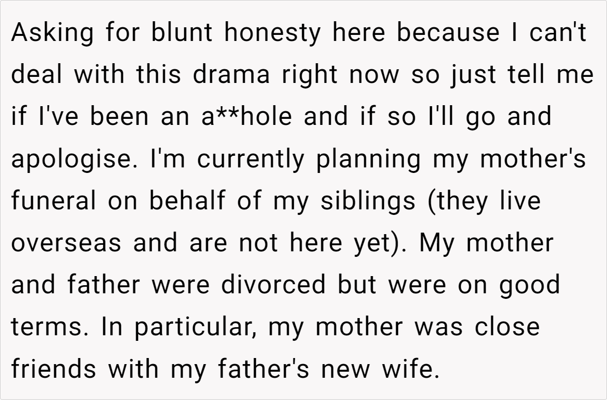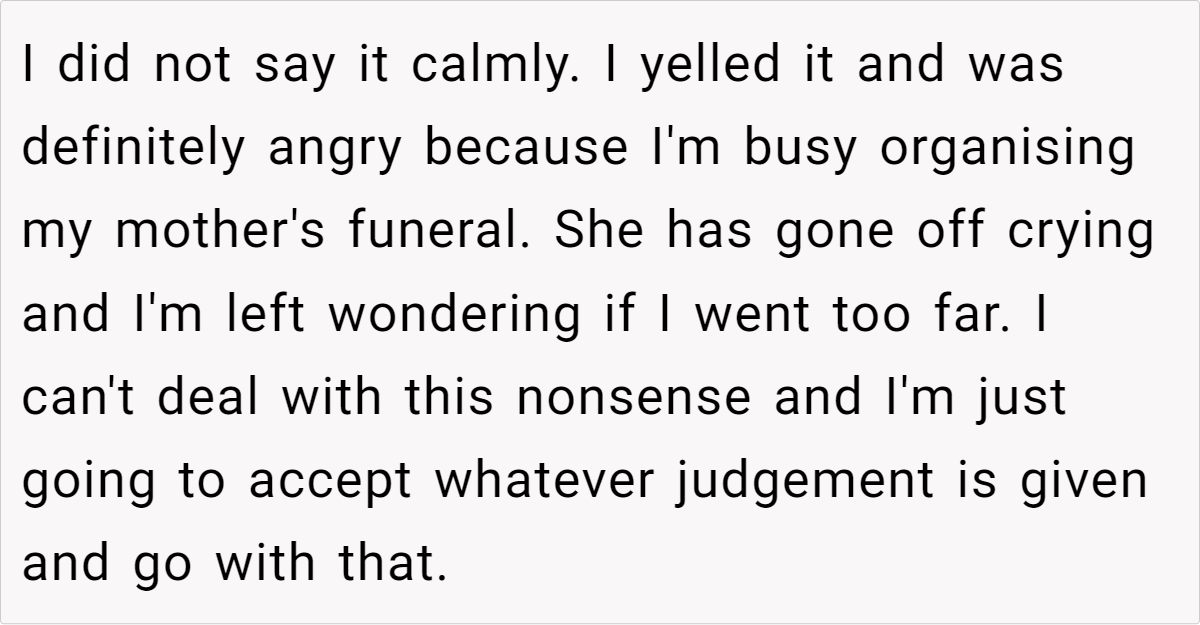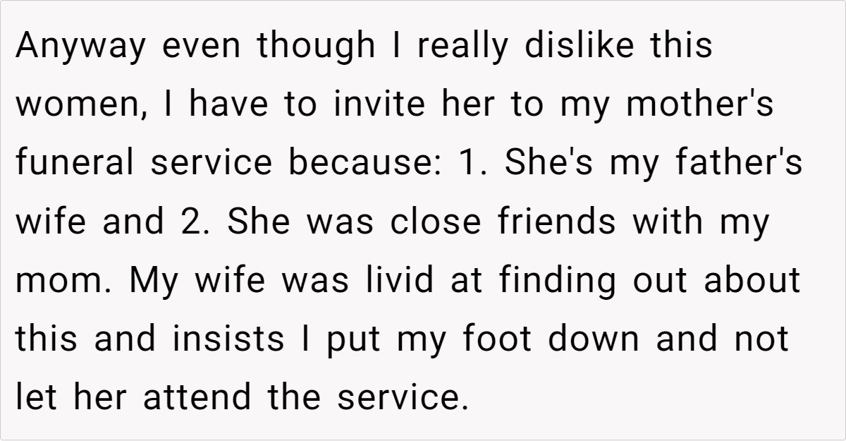 A Reddit user found himself in a tense conflict with his wife while planning his mother’s funeral. His wife was furious that he insisted on inviting his father’s current wife—someone she has a long history of bad blood with—despite the woman’s close friendship with his late mother. After days of relentless pressure from his wife to uninvite her, the user snapped and harshly told his wife to “just shut up already” and that she had no say in the matter. Now, with his wife in tears, he wonders if he went too far. Read the full story below.