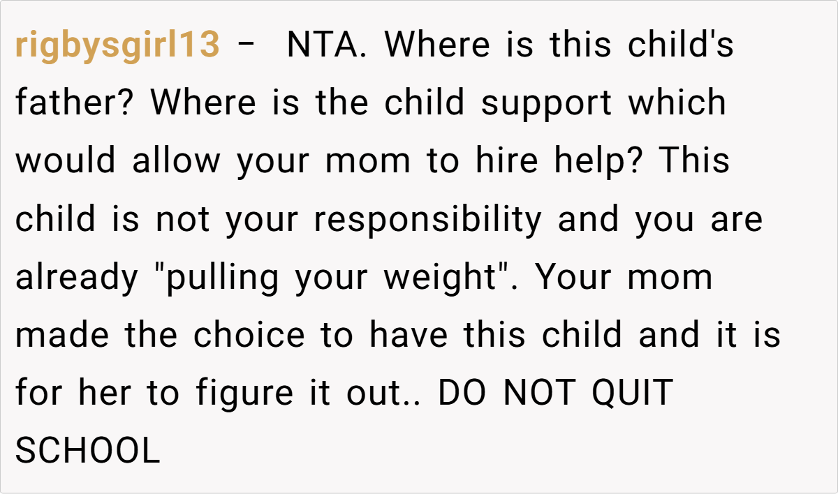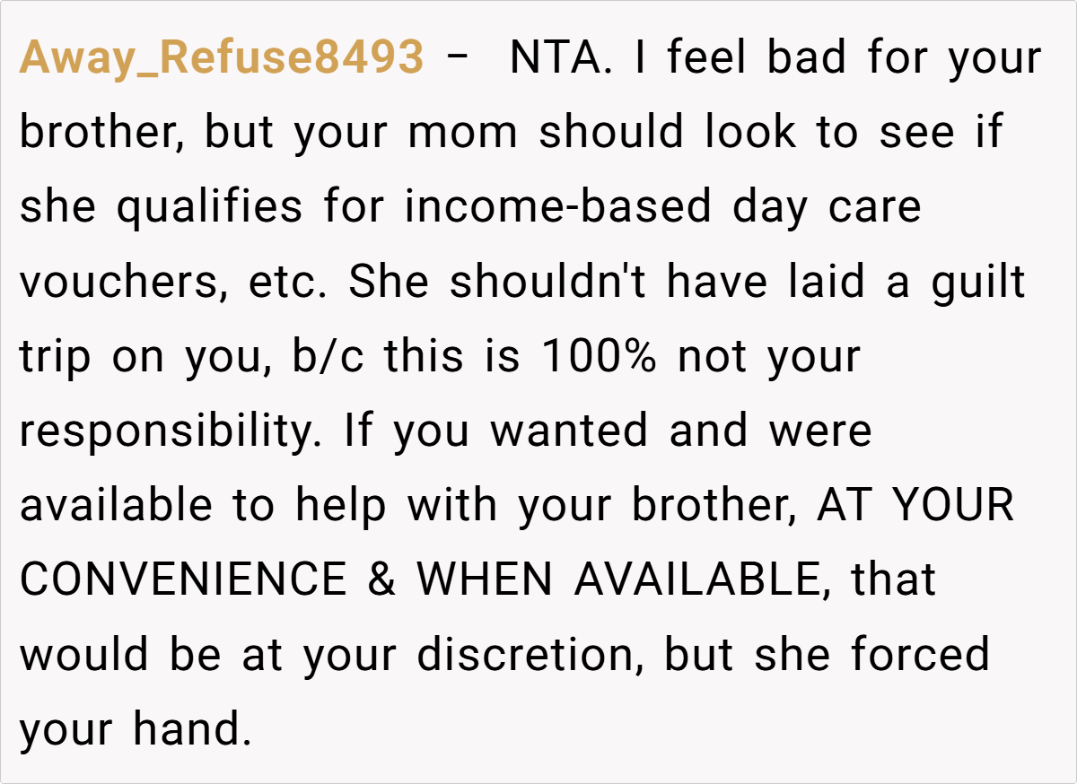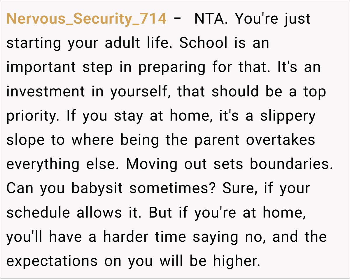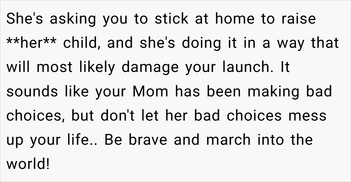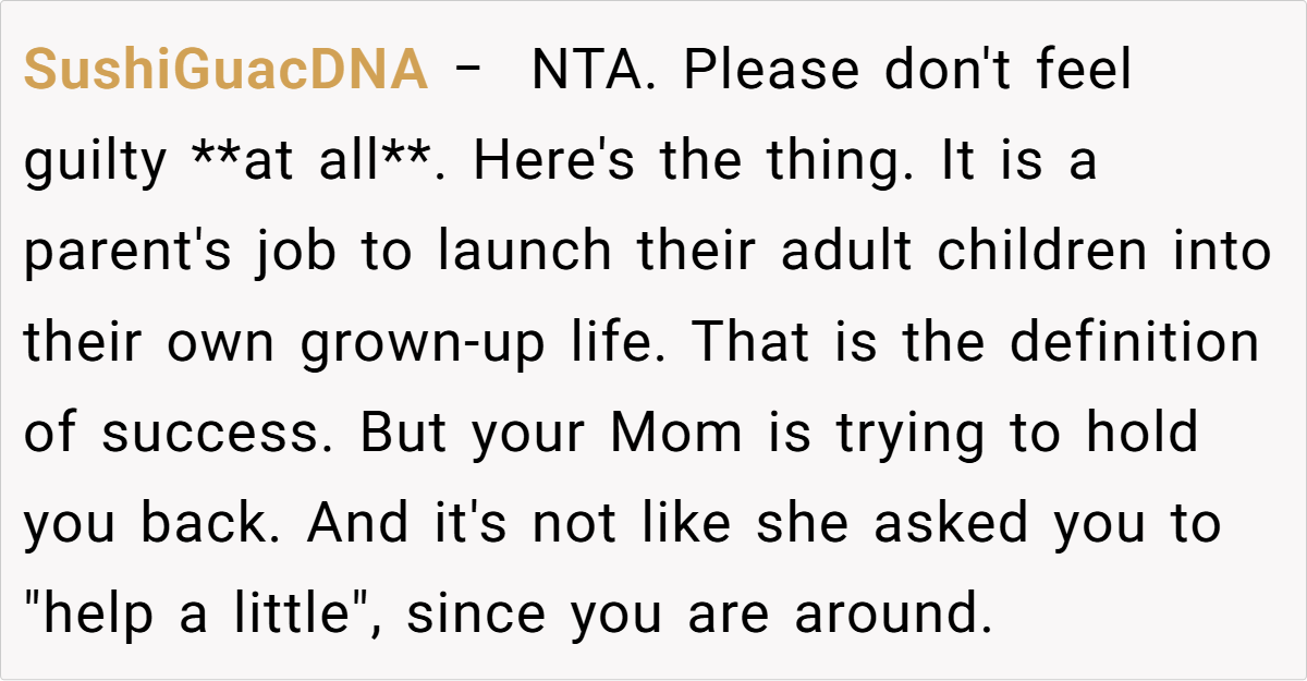 Many redditors express a mix of sympathy and amusement at the dilemma of balancing family duty with personal freedom. Some quip that she’s “adulting like a boss,” while others wonder if her mom’s expectations are a relic of a bygone era. These spirited discussions serve as a reminder that while opinions may vary, the struggle to balance personal ambitions with family obligations is a universally relatable challenge.