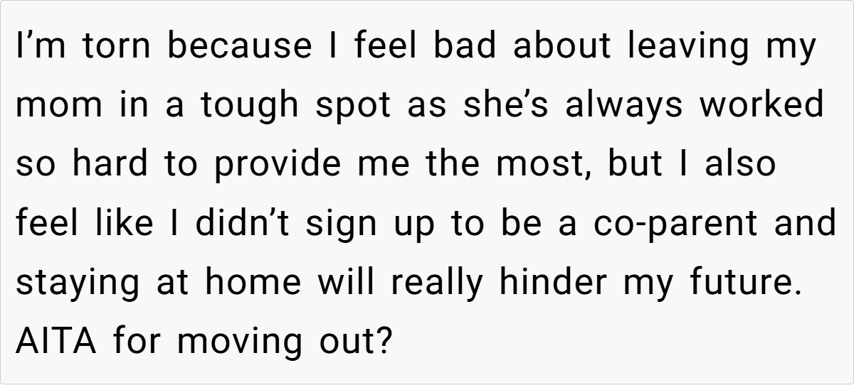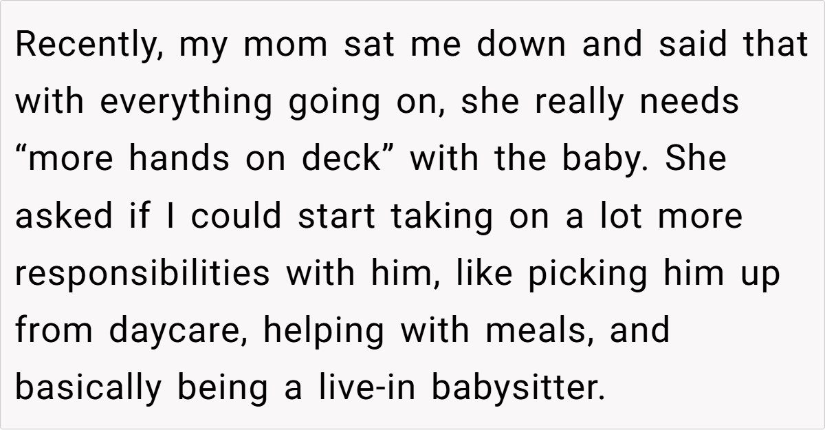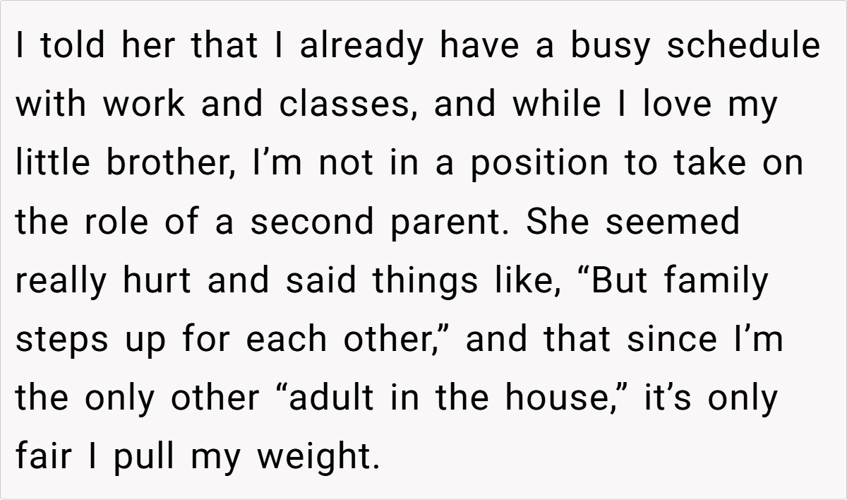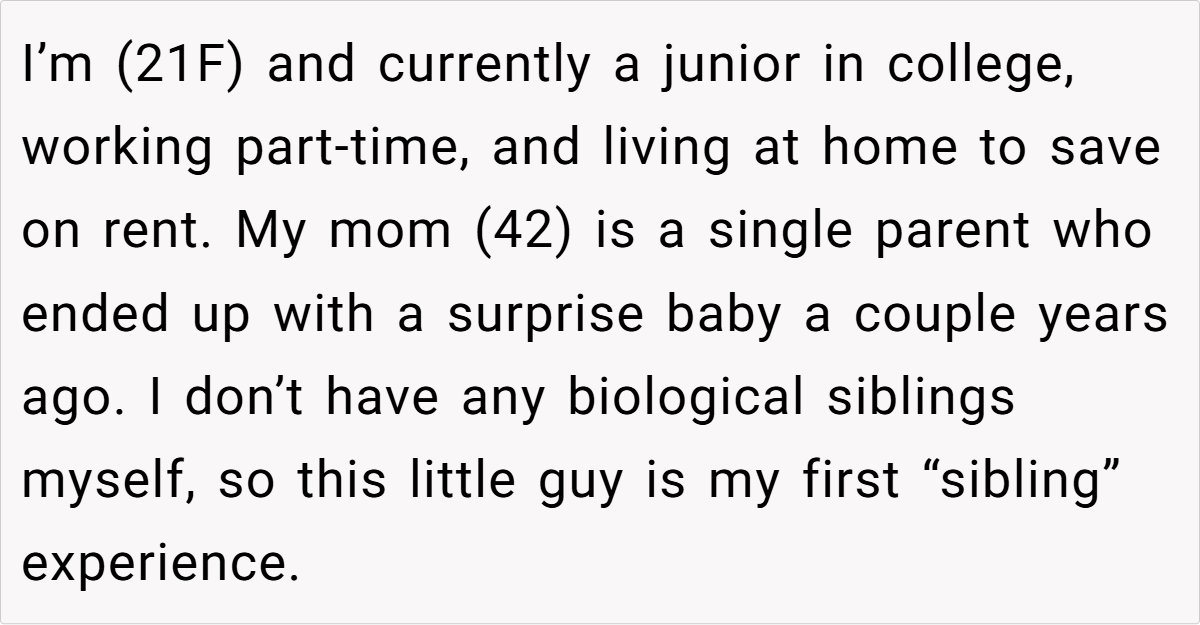 In the midst of a bustling college life, juggling classes, work, and personal aspirations, sometimes the call of family can feel overwhelming. This story takes us into the life of a 21-year-old college junior who, despite her deep love for her family, finds herself at a crossroads when her mother asks her to take on the role of a full-time caregiver for her 2-year-old half-brother. The request, though wrapped in familial duty, threatens to derail her carefully laid plans for the future, setting the stage for an emotionally charged decision.