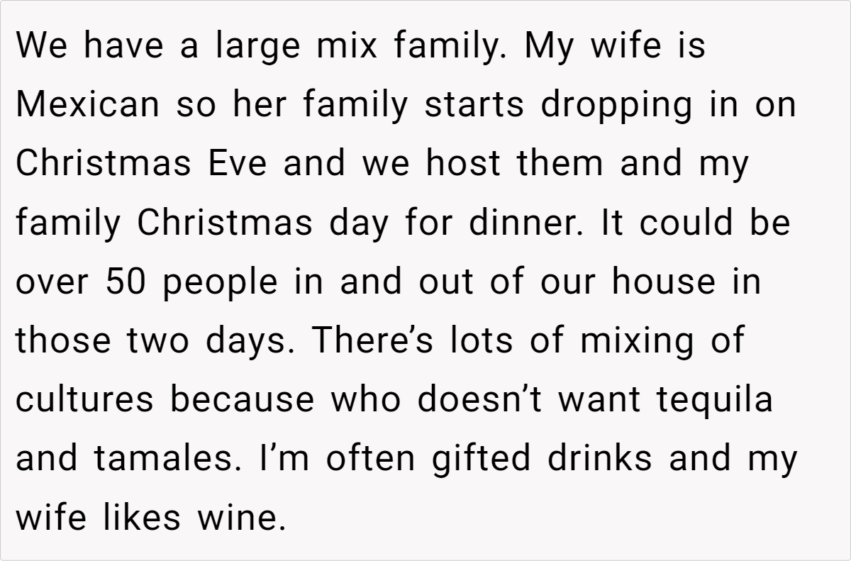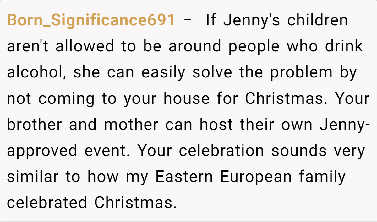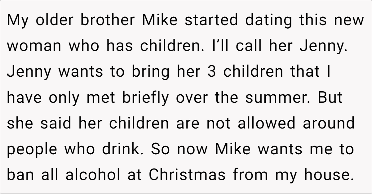 A Reddit user faced a family conflict when their brother’s new girlfriend, Jenny, requested a ban on alcohol during Christmas to accommodate her children’s strict rules. The user, who hosts large cultural and family gatherings during the holidays, refused, citing the importance of their family traditions and the impracticality of altering them for guests they barely know.