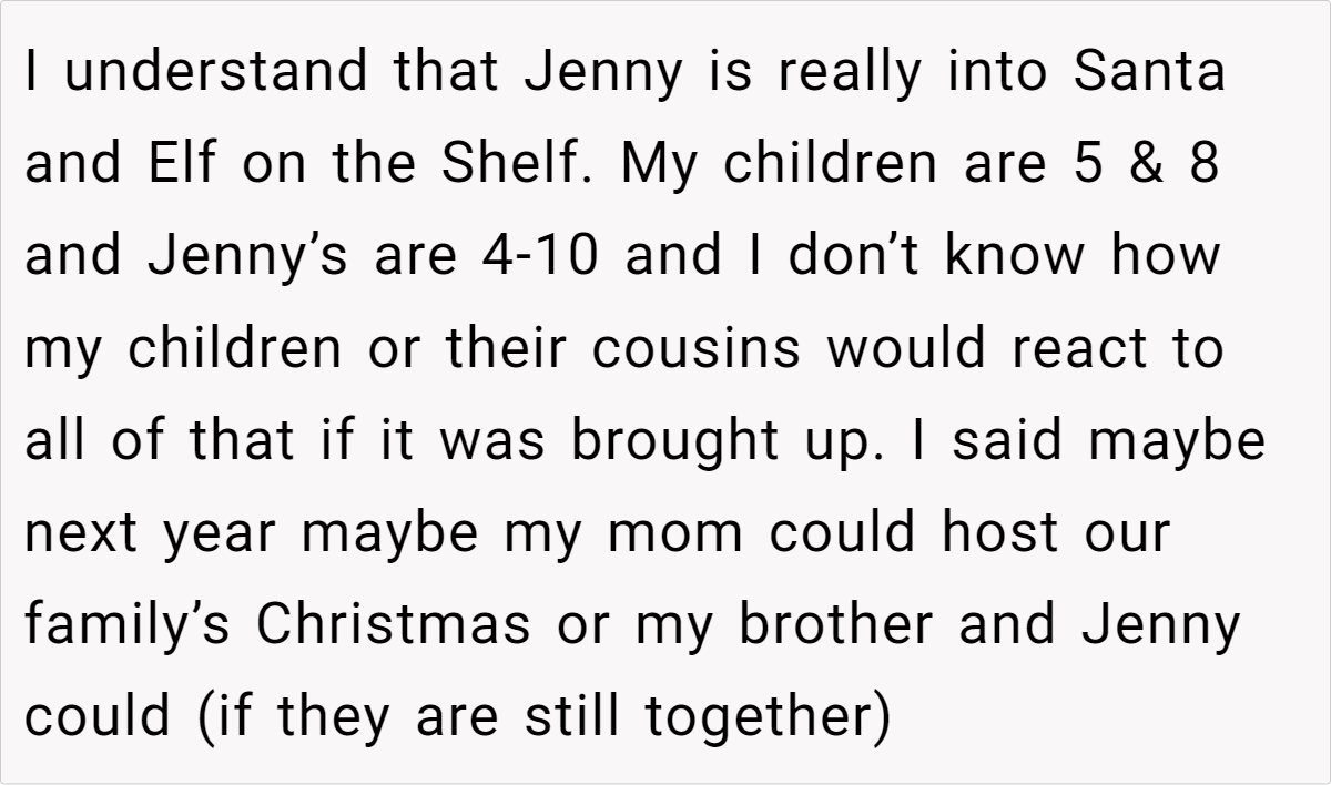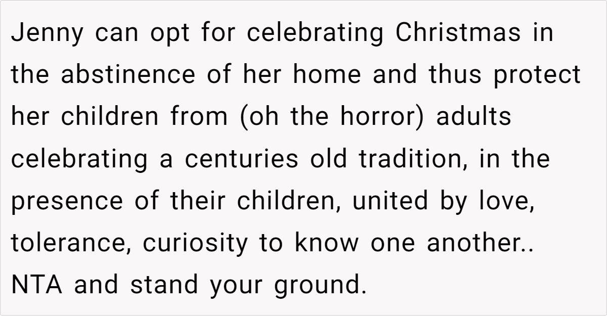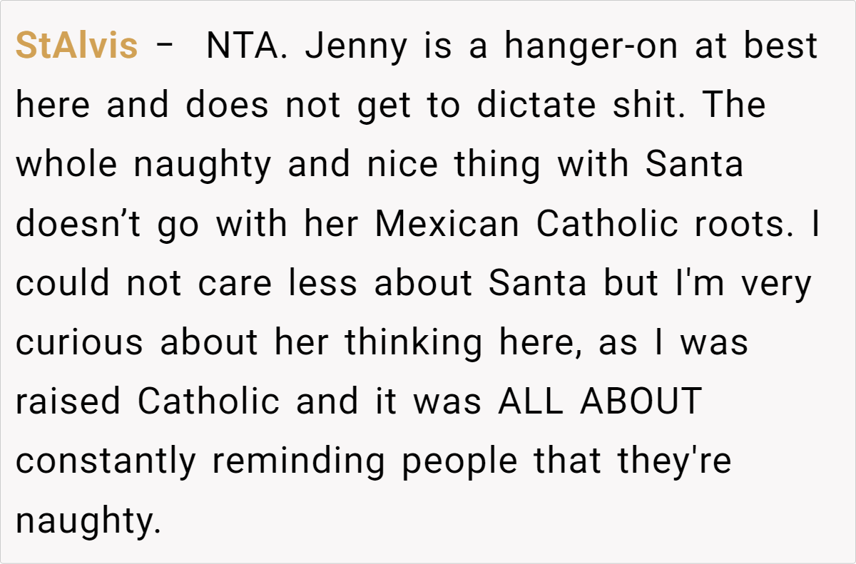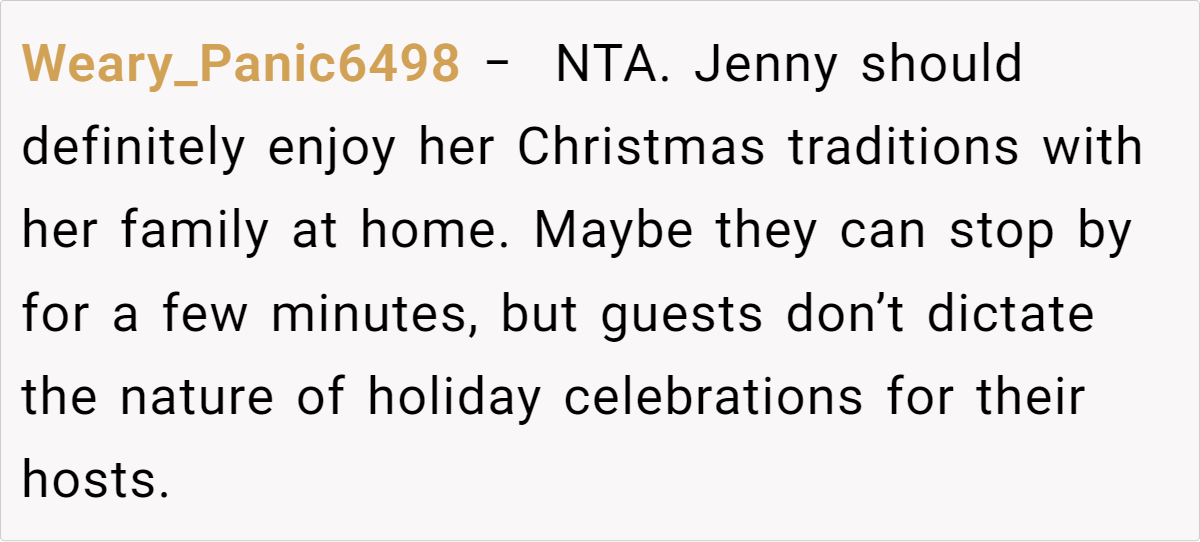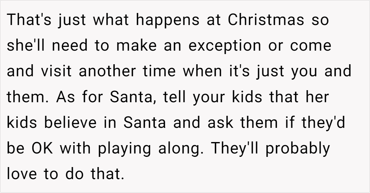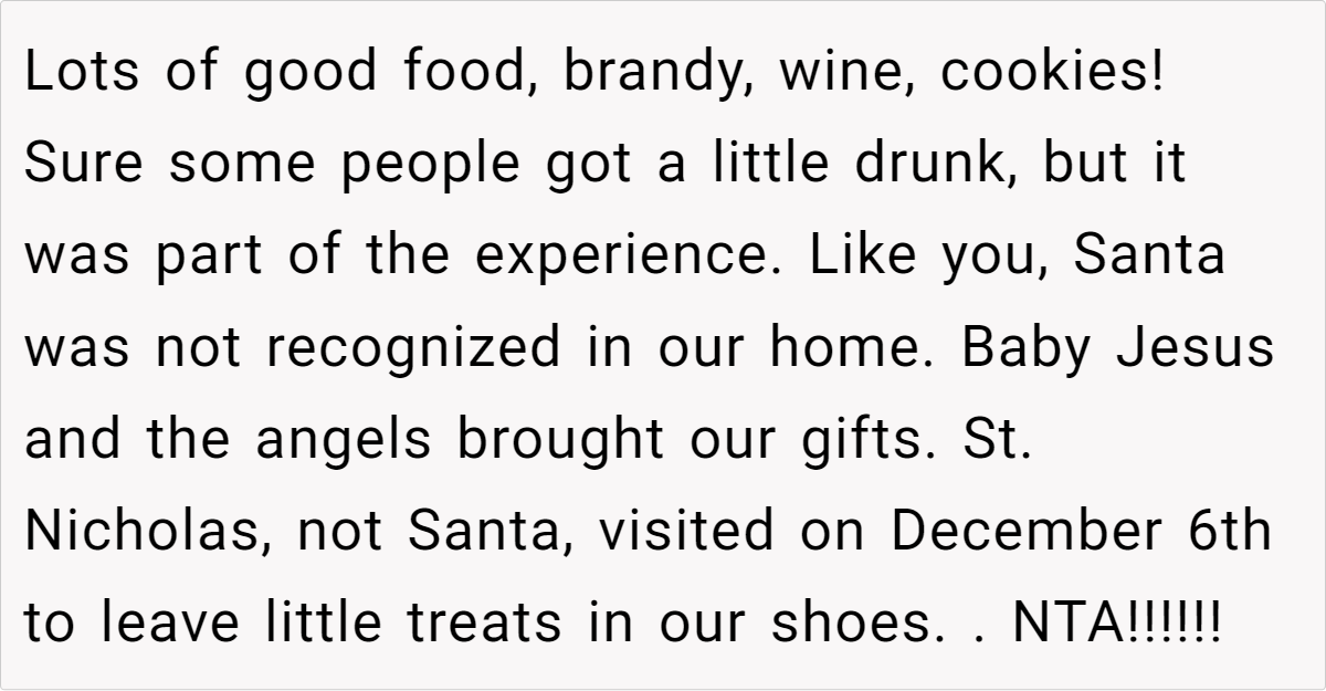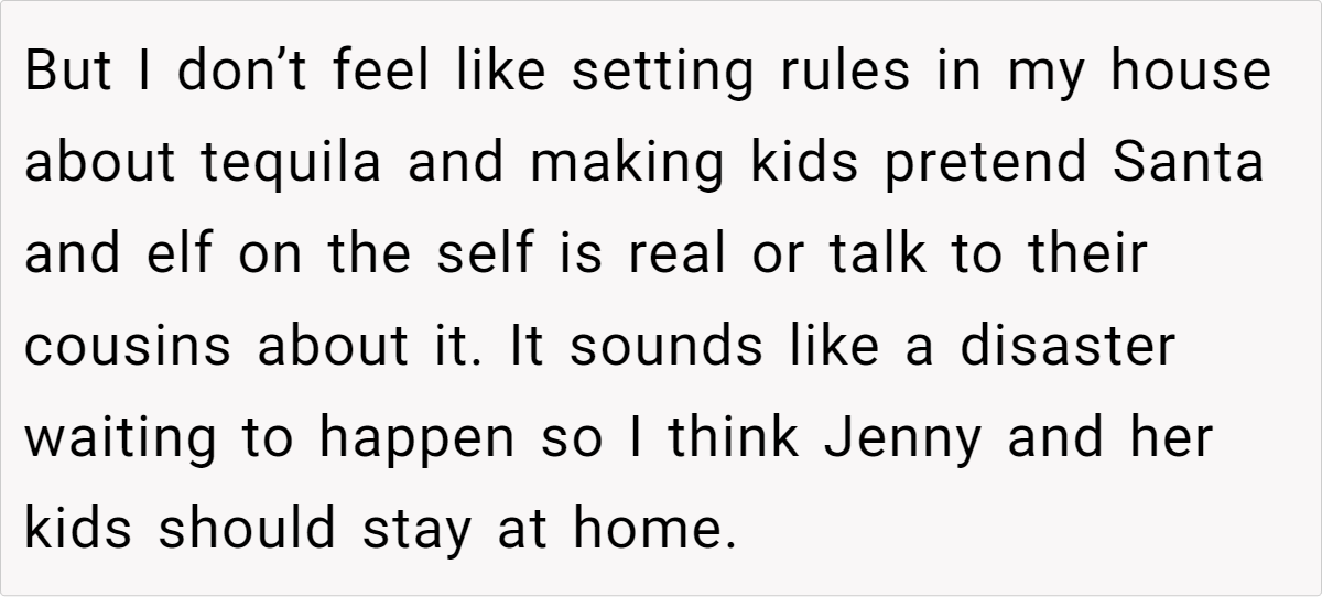 Reddit’s top comments overwhelmingly side with the host: “NTA. Your house, your rules.” Users critique Jenny’s entitlement, arguing newcomers shouldn’t dictate terms. Some, like u/Yikes44, suggest practical fixes: “Let kids play along with Santa—they’ll love it!” Others, like u/anglflw, dismiss Jenny’s alcohol concerns: “Her kids won’t die seeing adults drink.”