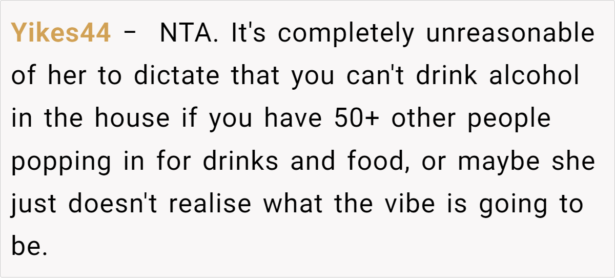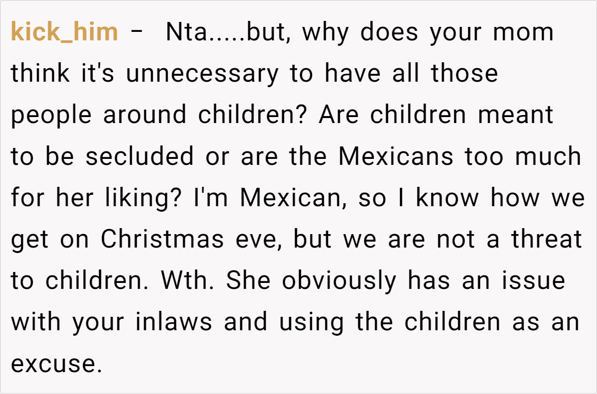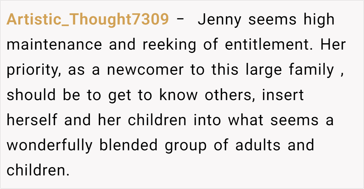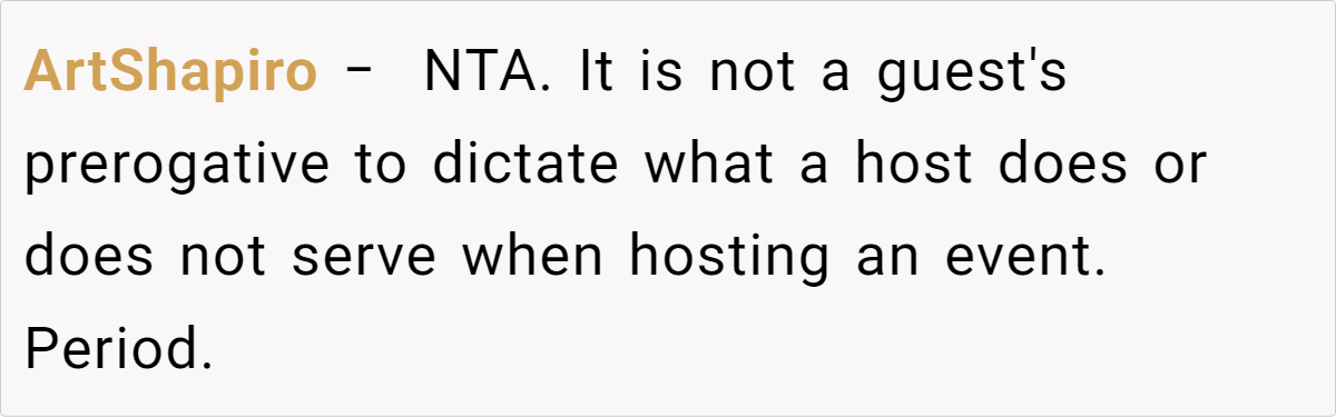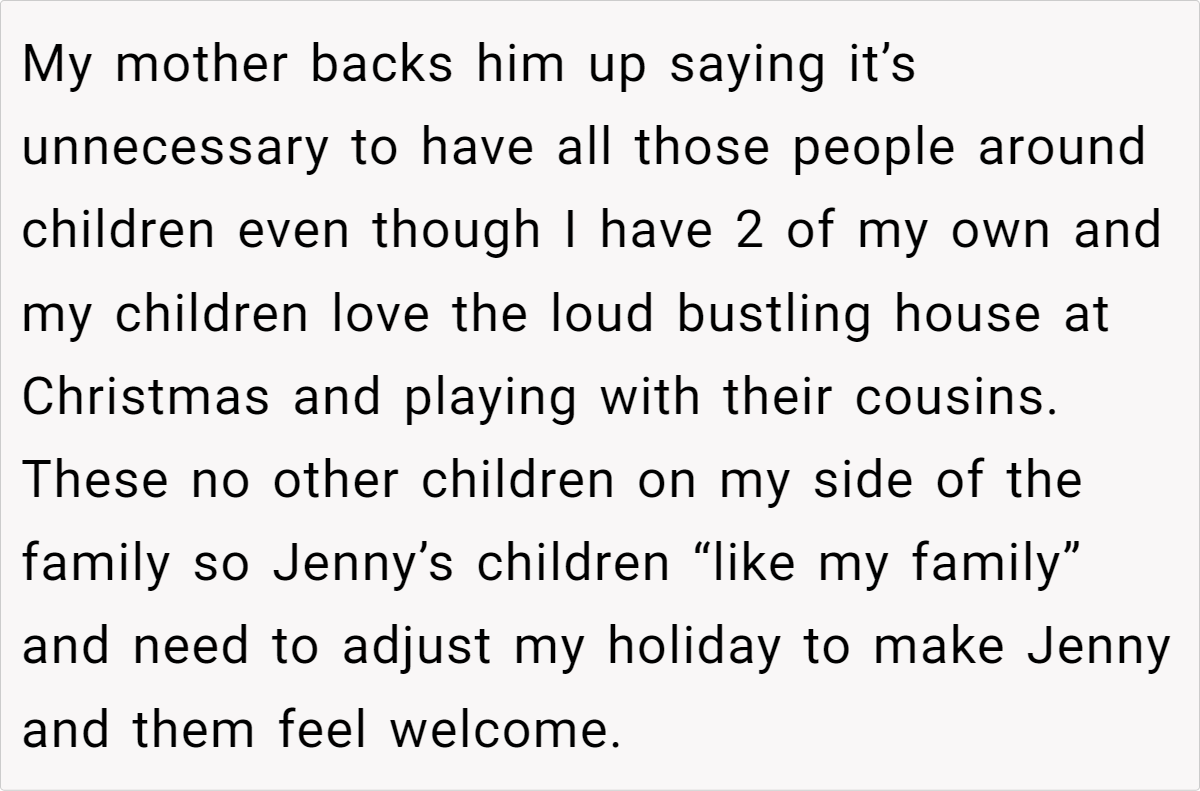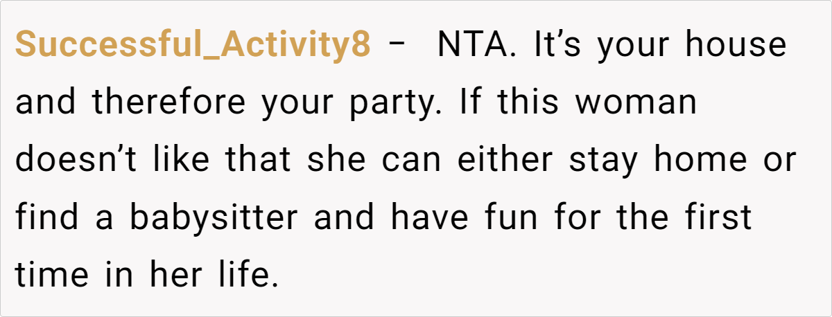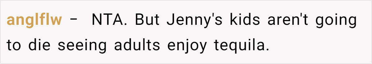 Reddit’s top comments overwhelmingly side with the host: “NTA. Your house, your rules.” Users critique Jenny’s entitlement, arguing newcomers shouldn’t dictate terms. Some, like u/Yikes44, suggest practical fixes: “Let kids play along with Santa—they’ll love it!” Others, like u/anglflw, dismiss Jenny’s alcohol concerns: “Her kids won’t die seeing adults drink.”