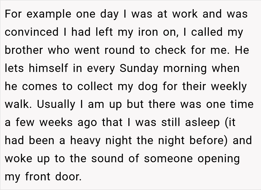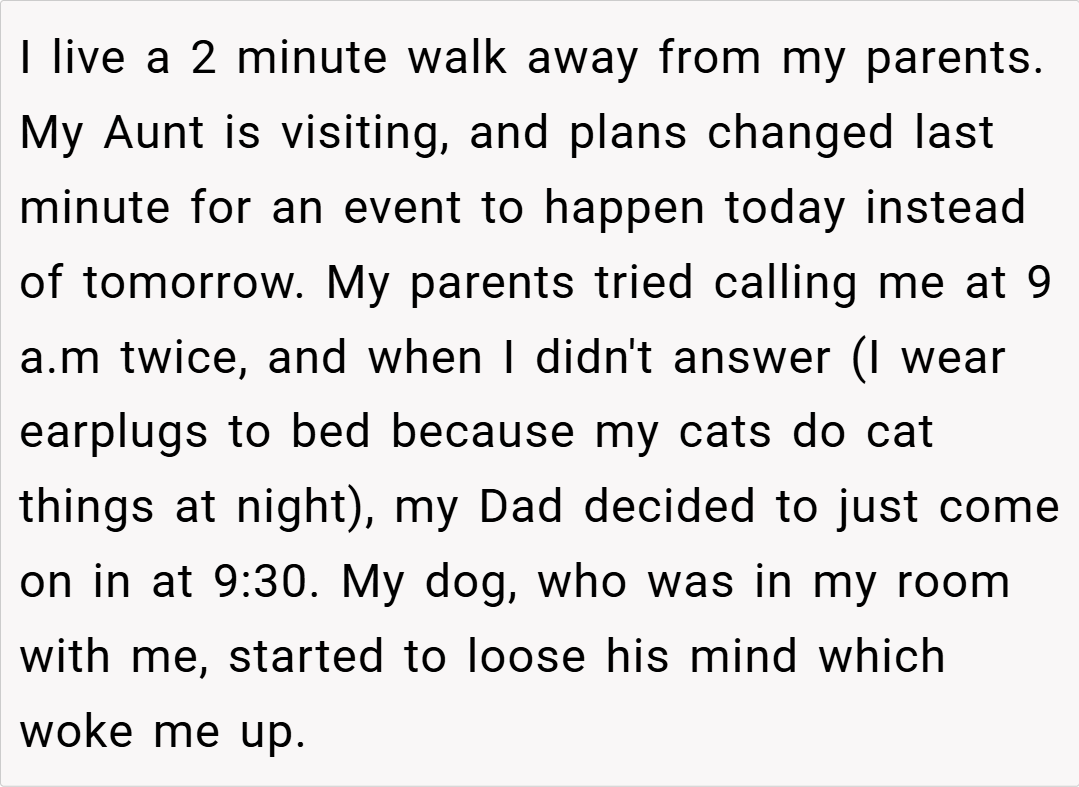 Picture a peaceful Sunday morning: the soft purr of cats, the gentle rustling of sheets, and the blissful silence provided by earplugs – until suddenly, that tranquility is shattered by a barking dog and the realization that someone has entered your home. For one homeowner living just two minutes away from their parents, this scenario became a jarring reality that sparked a heated debate about boundaries, privacy, and the delicate balance of maintaining close family ties while establishing personal space.