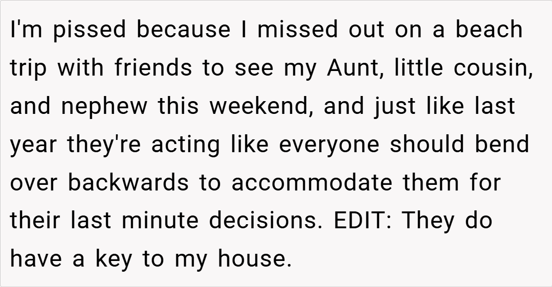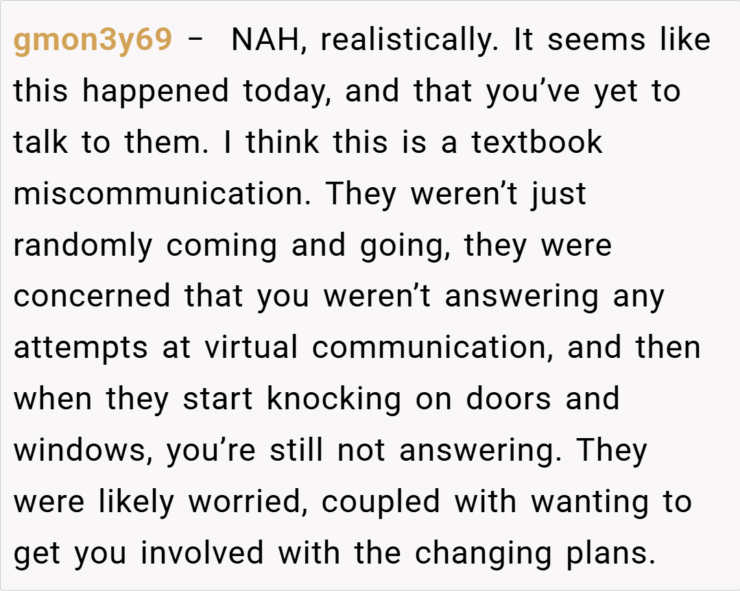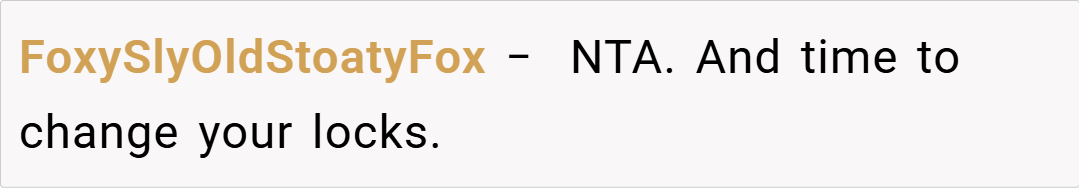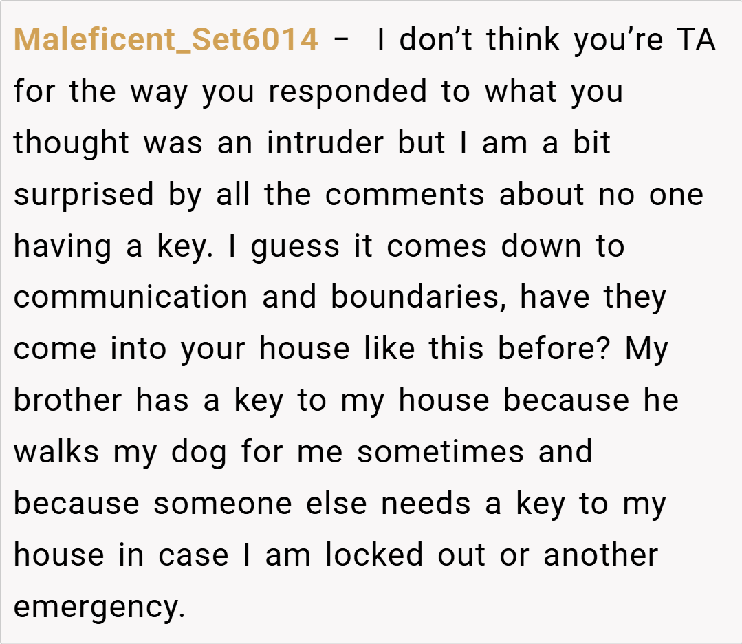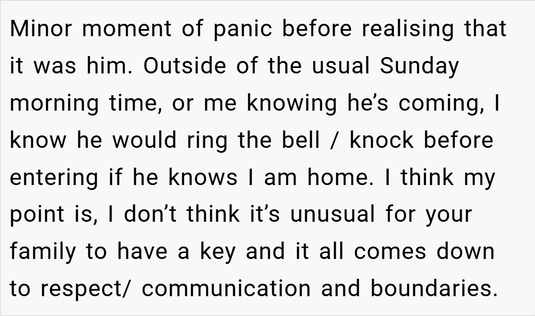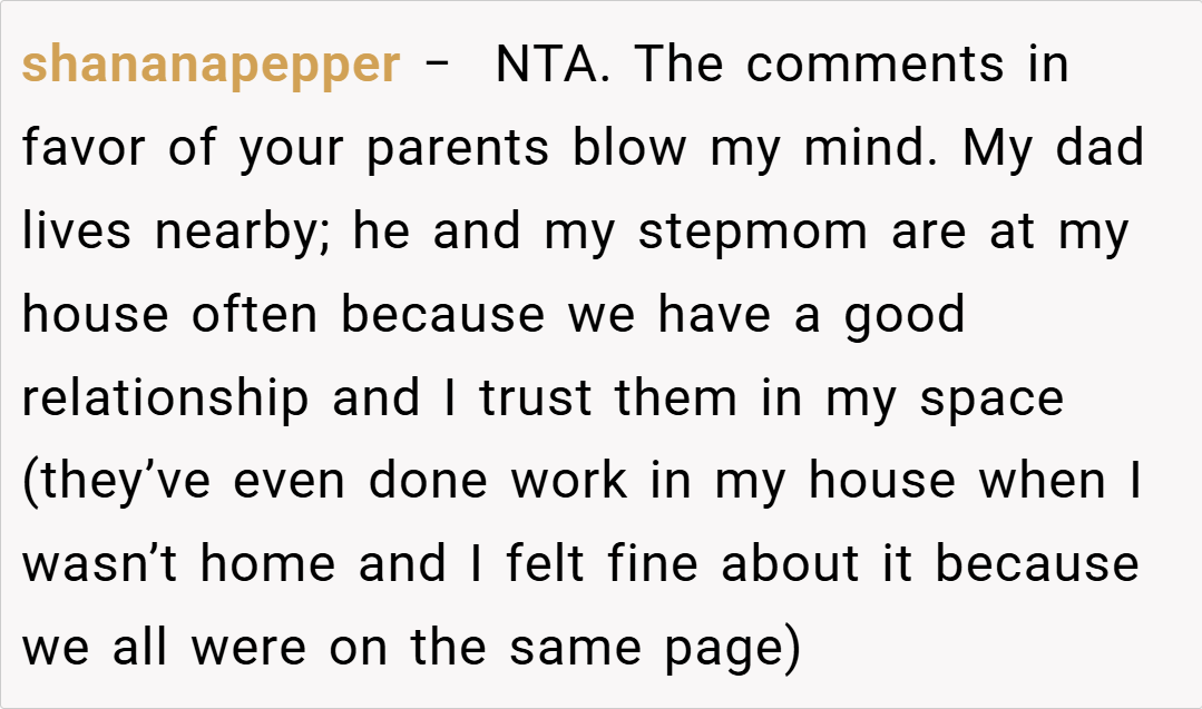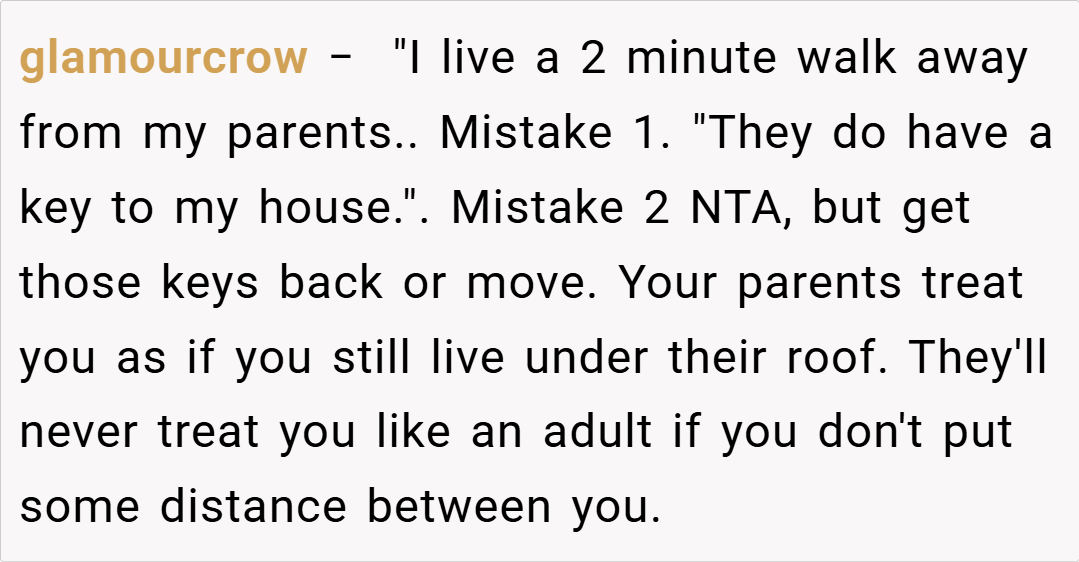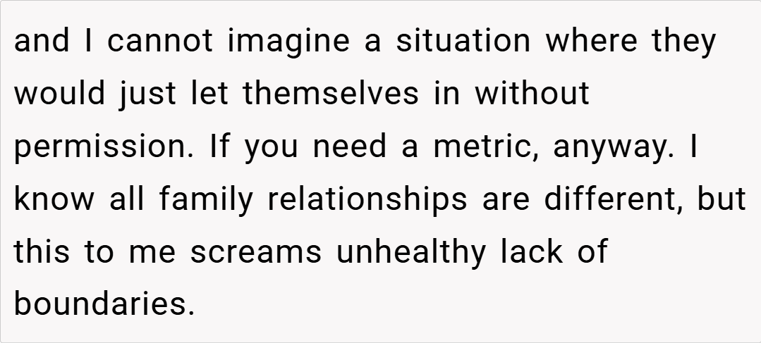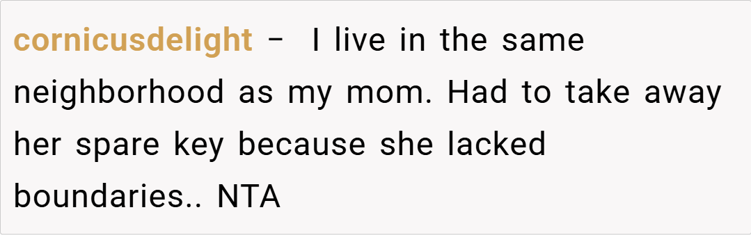 Some users shared their own similar experiences. “I live in the same neighborhood as my mom. Had to take away her spare key because she lacked boundaries,” one commenter revealed, highlighting how common these situations can be.