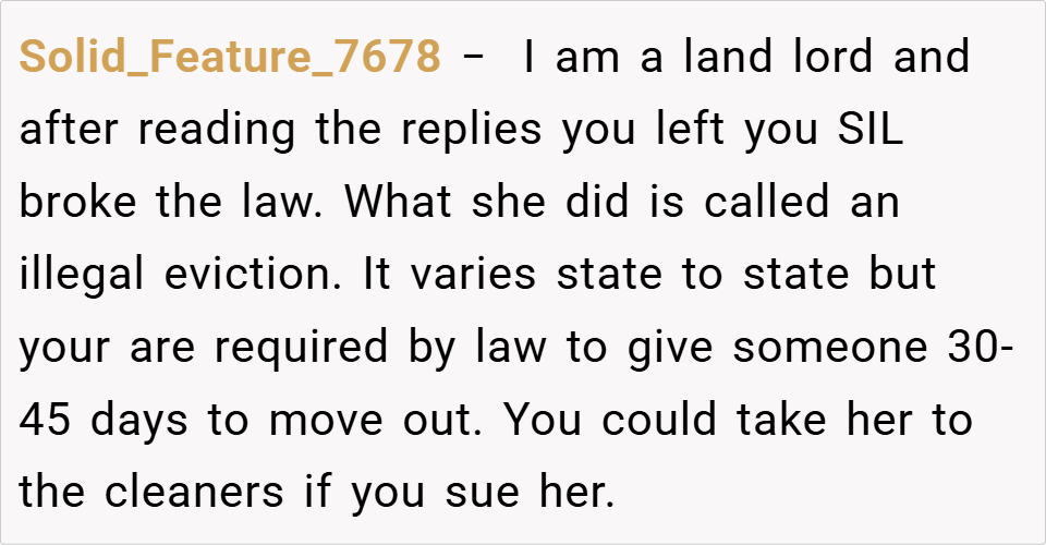 Tenant rights lawyer Mark Silverthorn notes: “In most jurisdictions, SIL’s abrupt eviction violates laws requiring 30-60 days’ notice. OP could sue for damages, especially given their financial losses from renting out their home.”