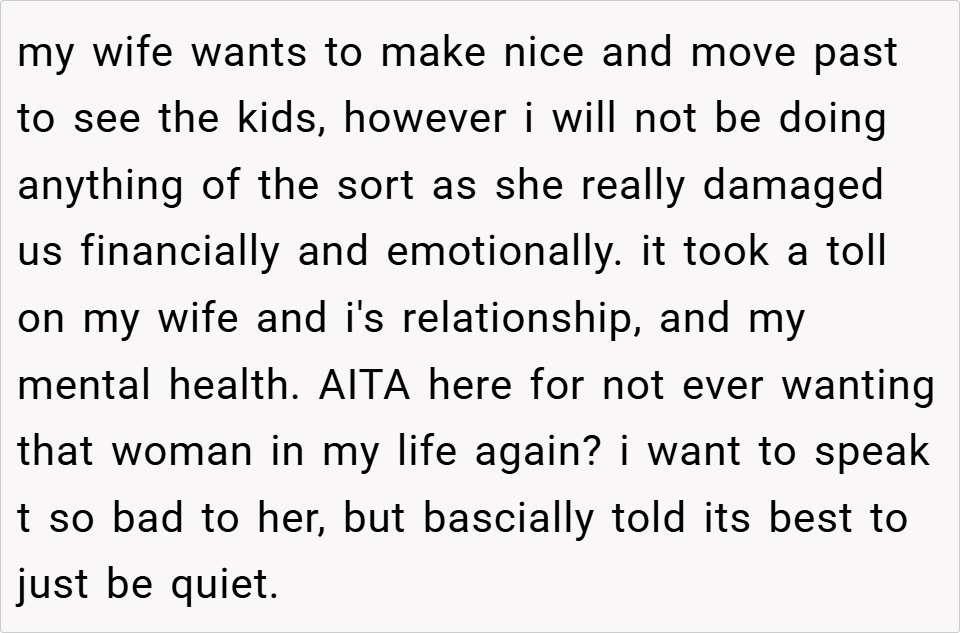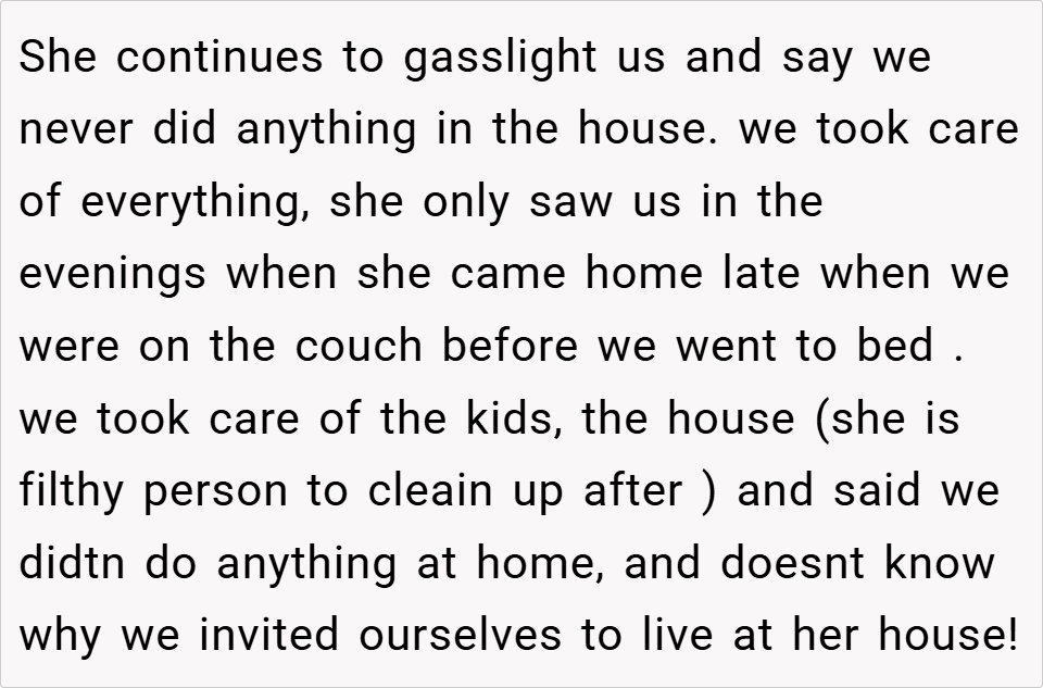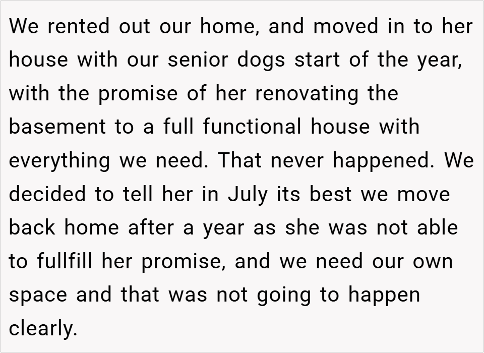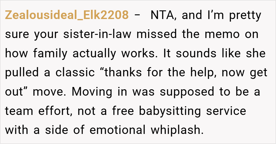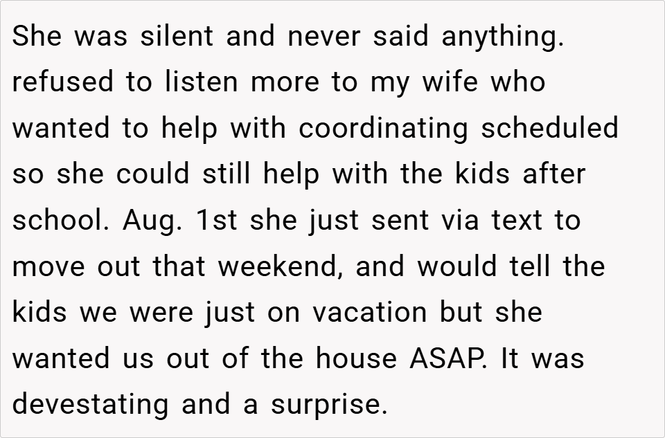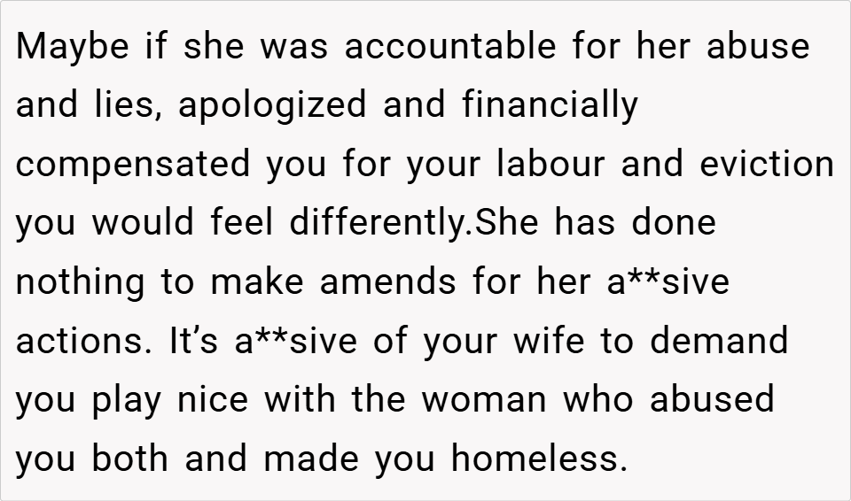 OP and their wife selflessly moved into SIL’s home, renting out their own, to help manage her chaotic life as a single mom and corporate president. Promised renovations to create a functional living space never materialized, and after months of unpaid labor (childcare, housekeeping, dog care), they announced plans to leave. SIL retaliated by evicting them via text, gaslighting them about their contributions, and severing their bond with her kids. Now, OP refuses to reconcile, while their wife seeks peace for the children’s sake.